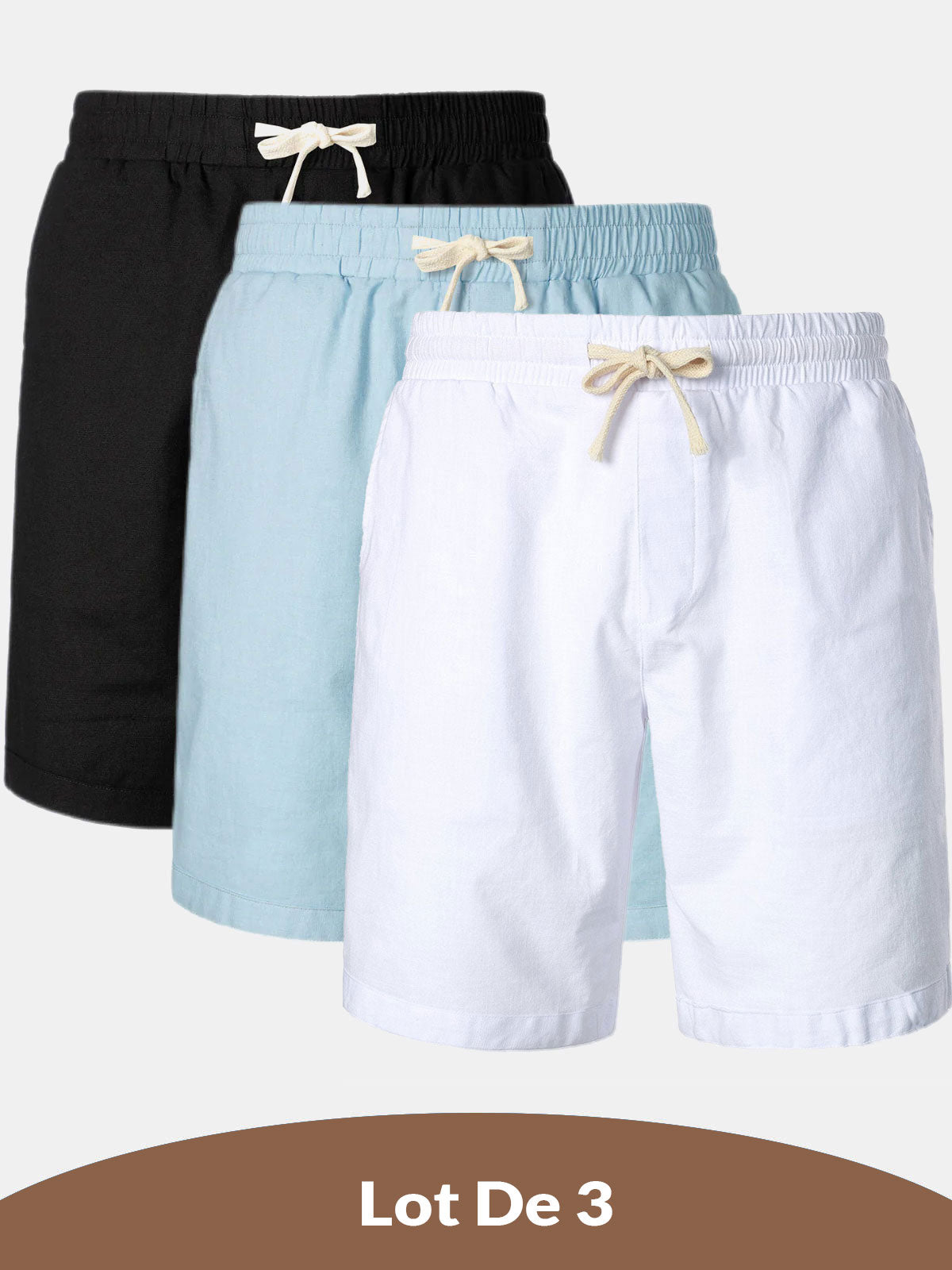 Lot de 3 | Shorts décontractés en lin et coton respirants de couleur unie pour hommes