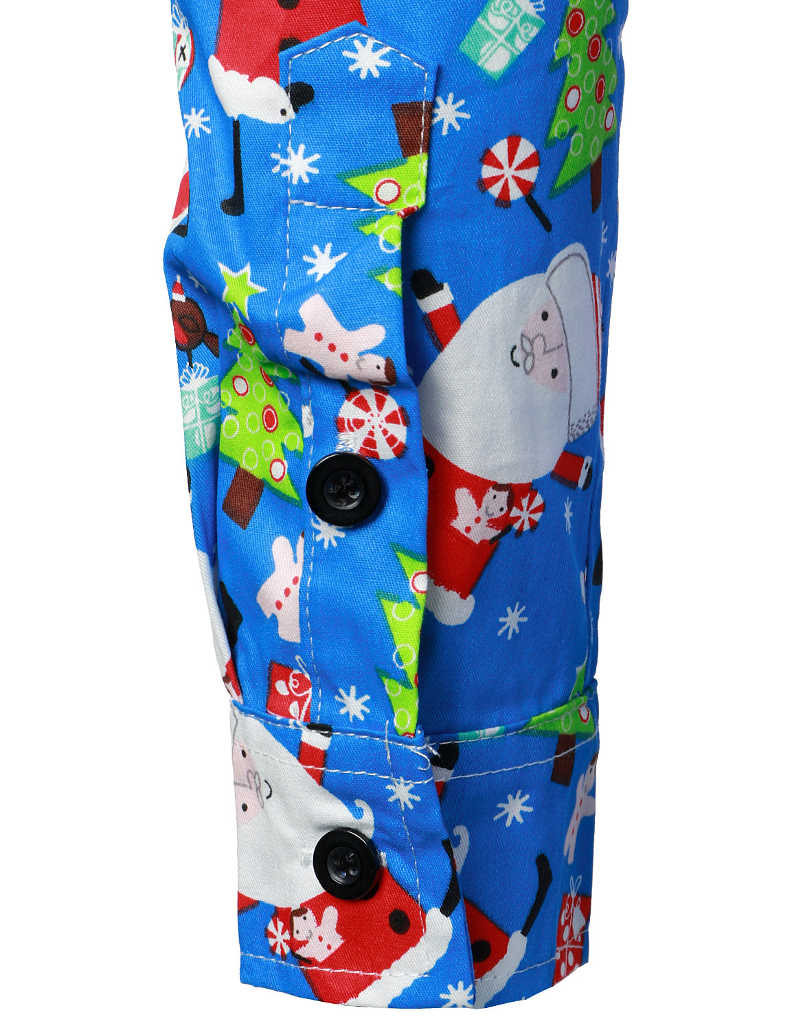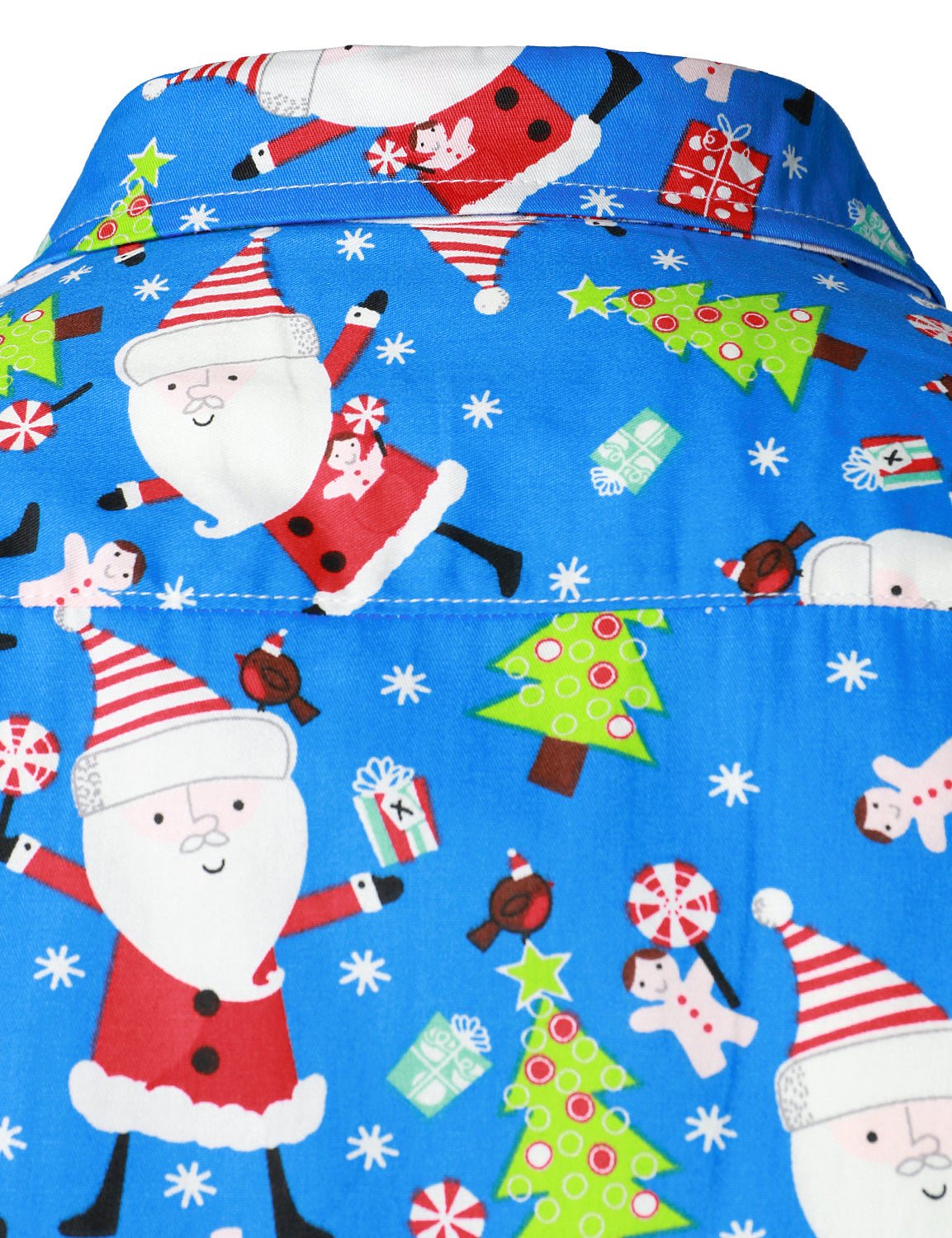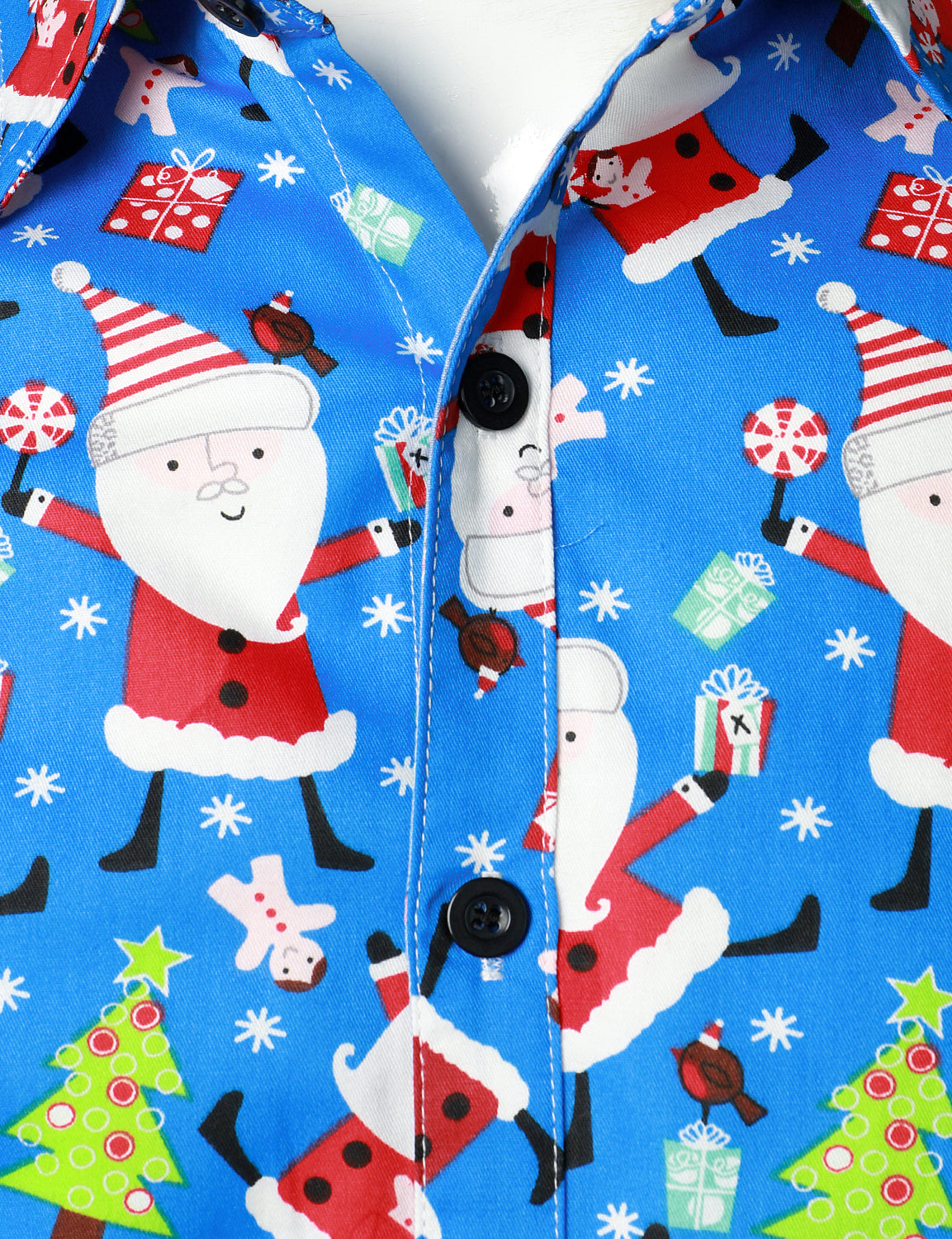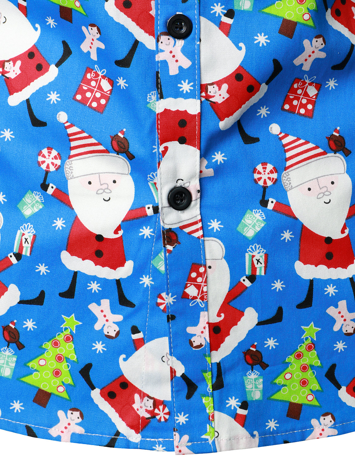 Chemise Habillée Père Noël Bleue à Manches Longues Imprimée de Noël pour Homme