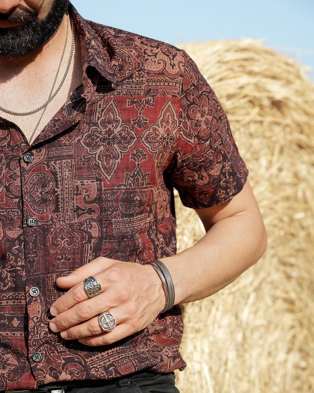 Chemise à manches courtes rétro tribale bohème marron à imprimé cachemire vintage pour homme des années 70