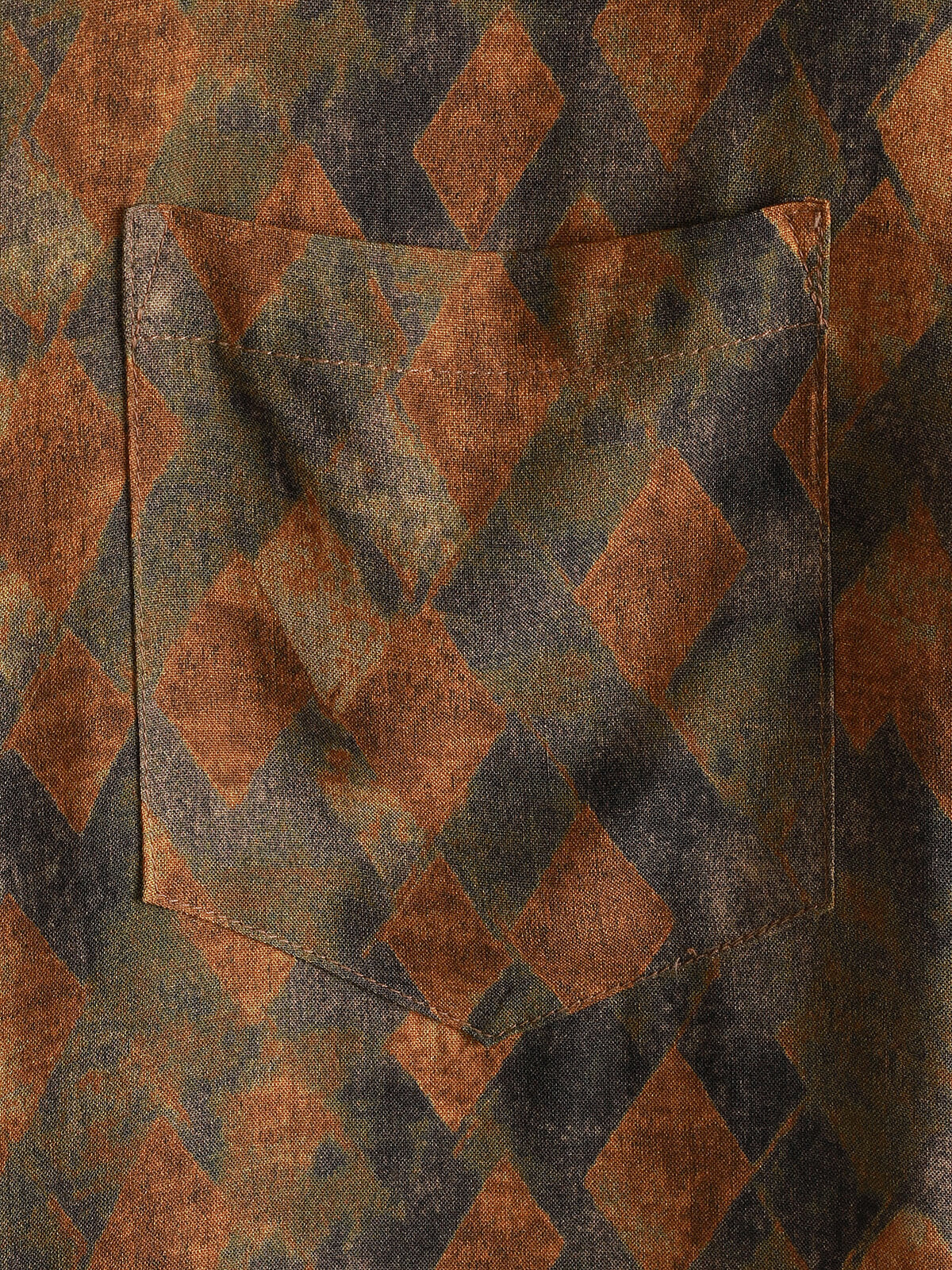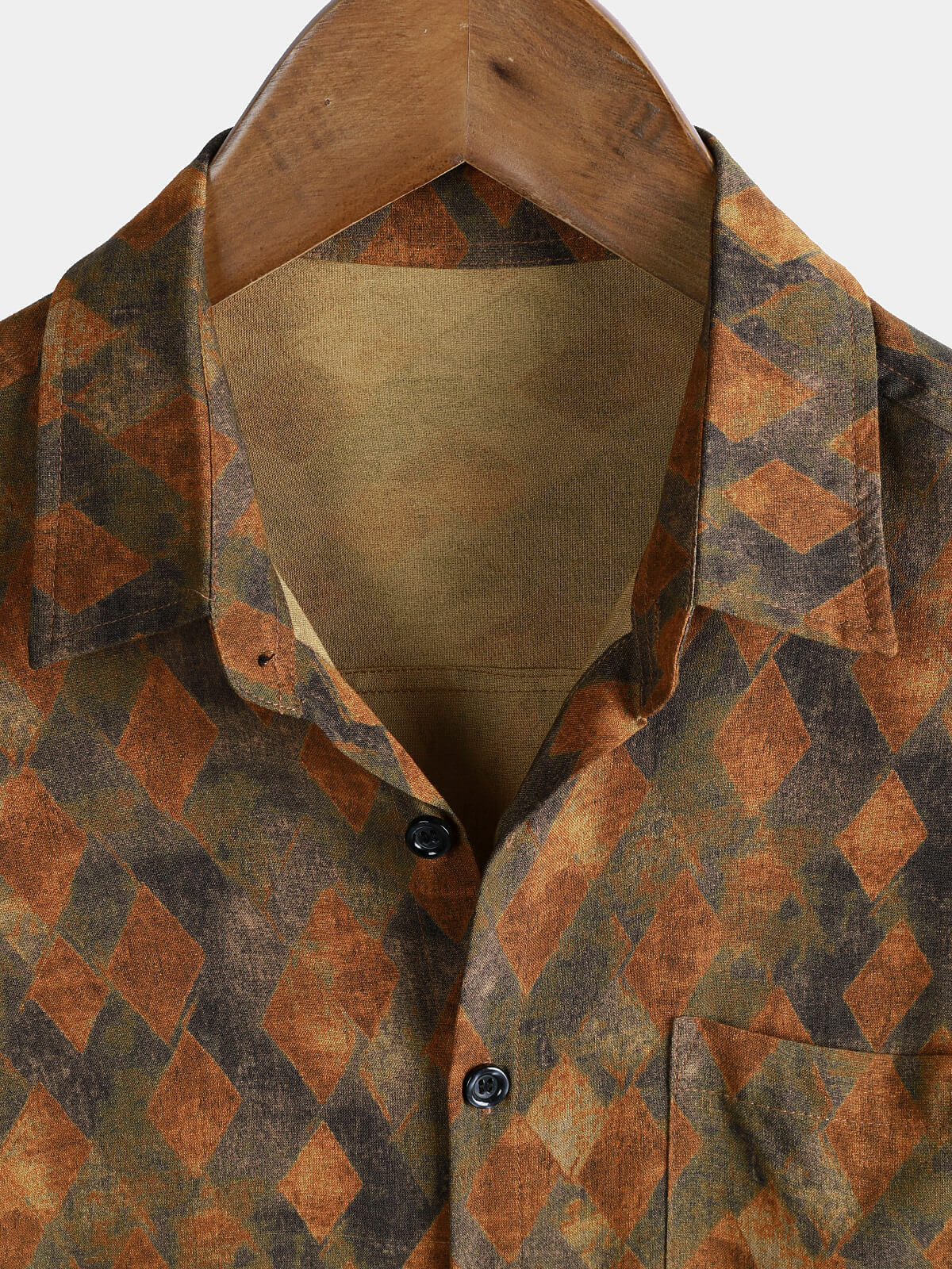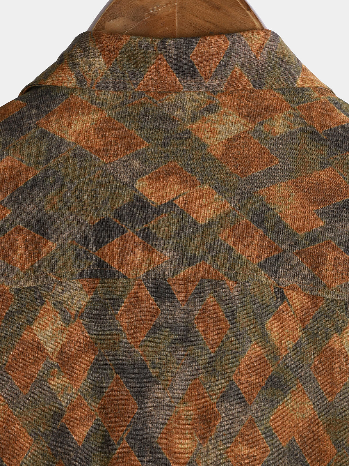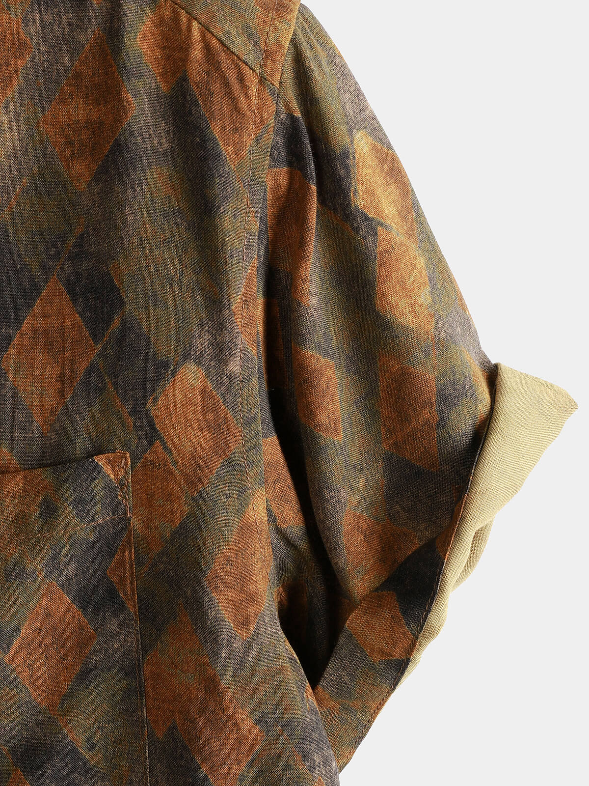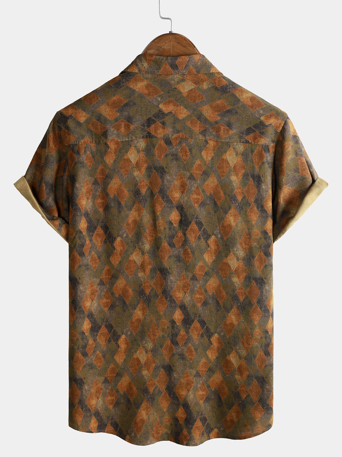 Chemise Homme Vintage Décontractée en Rayon Imprimé Carreaux Losanges à Manches Courtes
