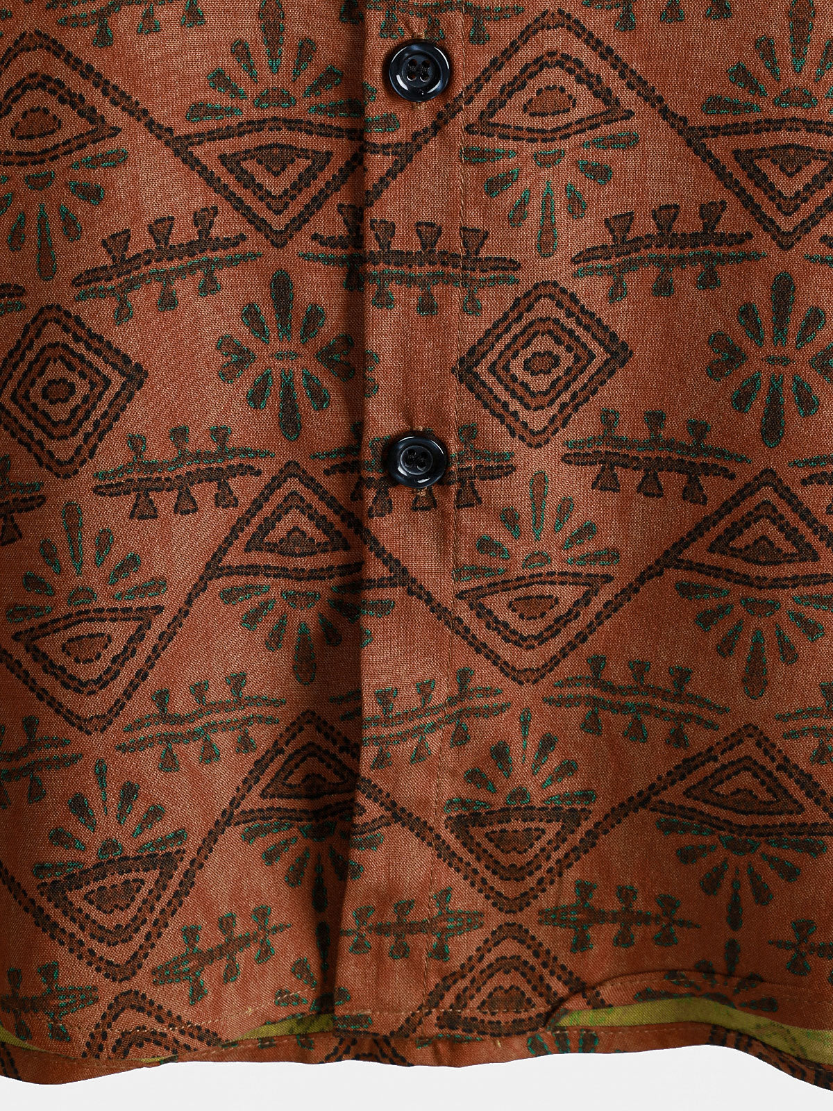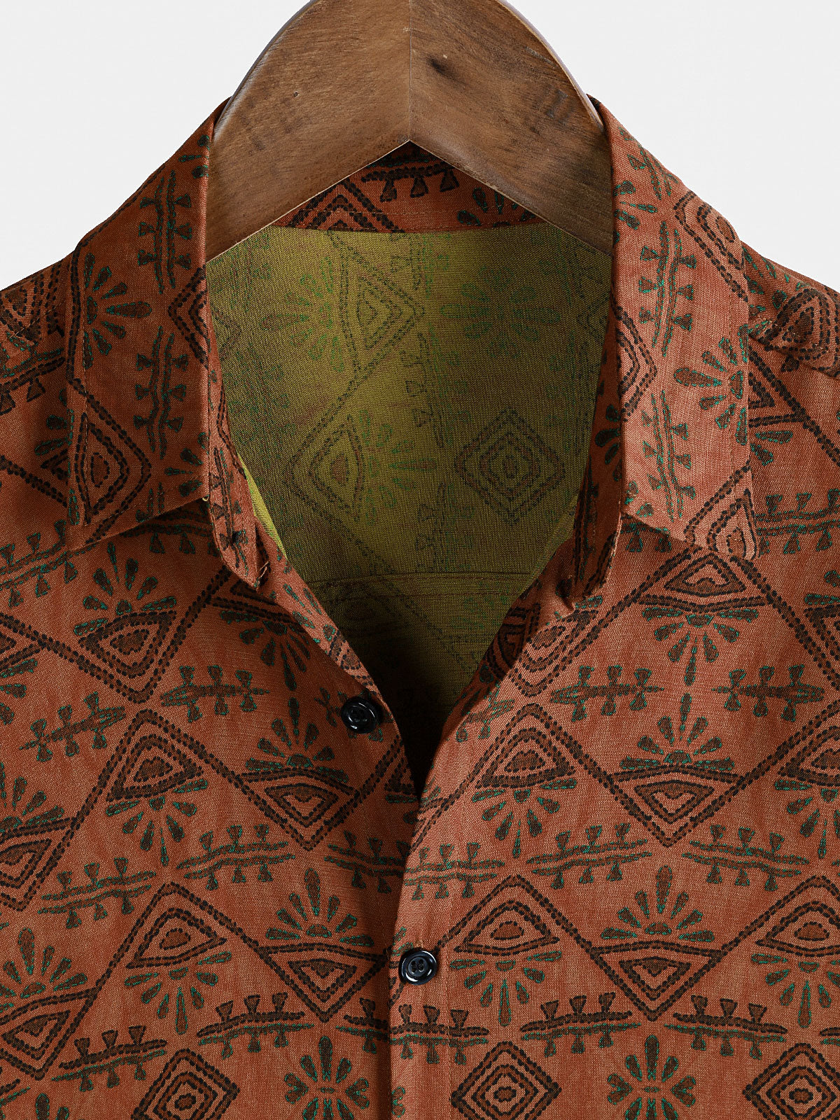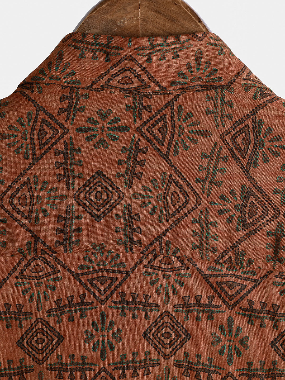 Chemise Homme Bohème en Rayon Imprimé Géométrique Tribal Orange à Manches Courtes