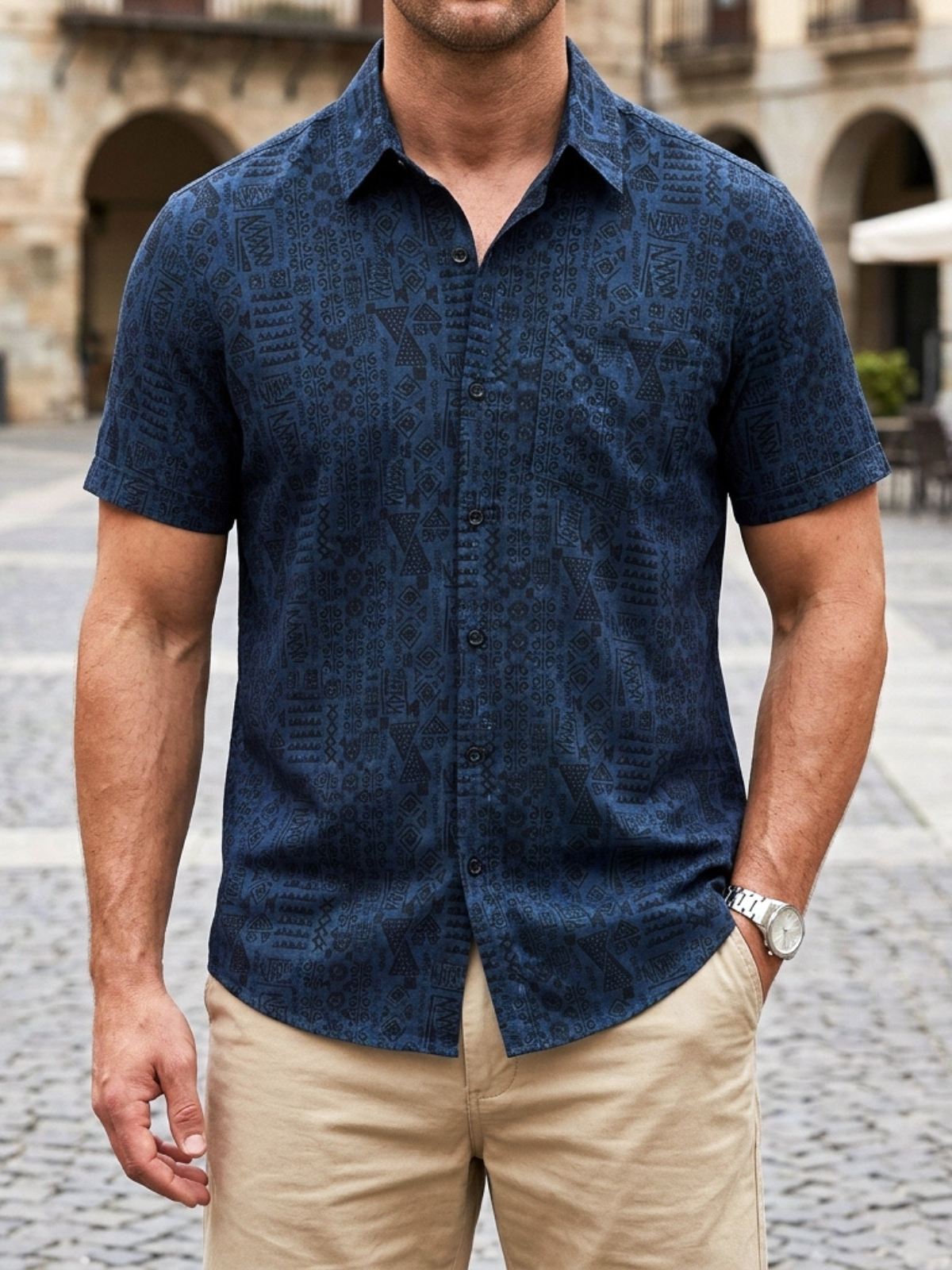 Chemise Homme Imprimé Géométrique Floral Bleu Marine Style Bohème Casual Manches Courtes