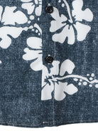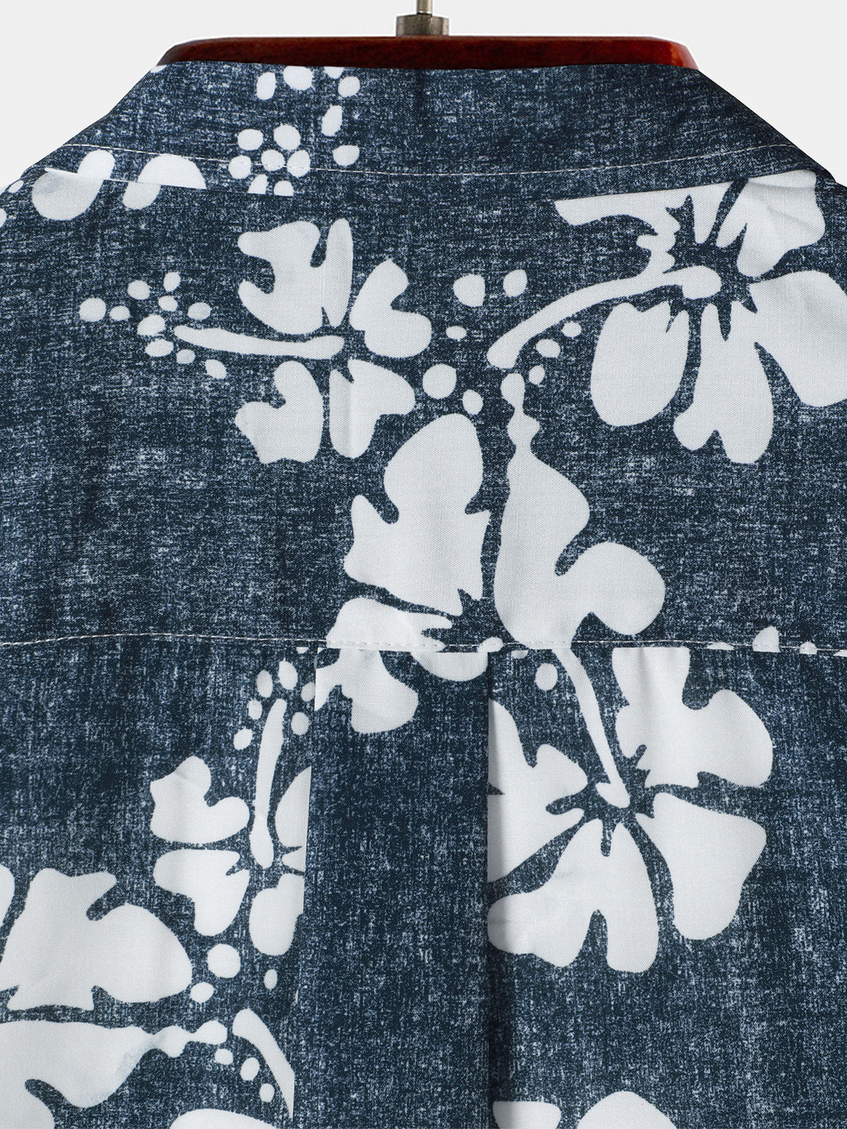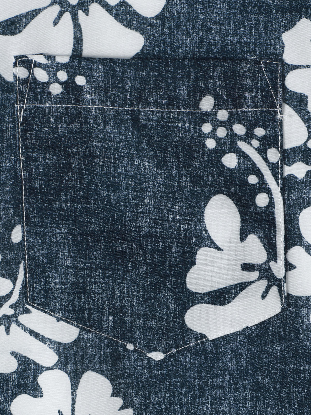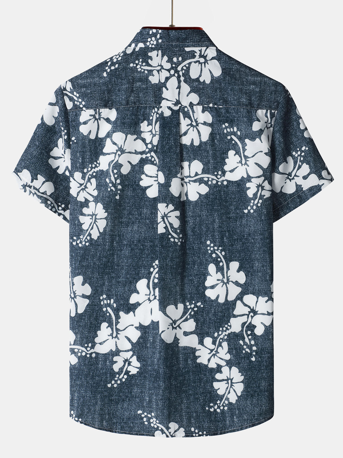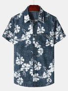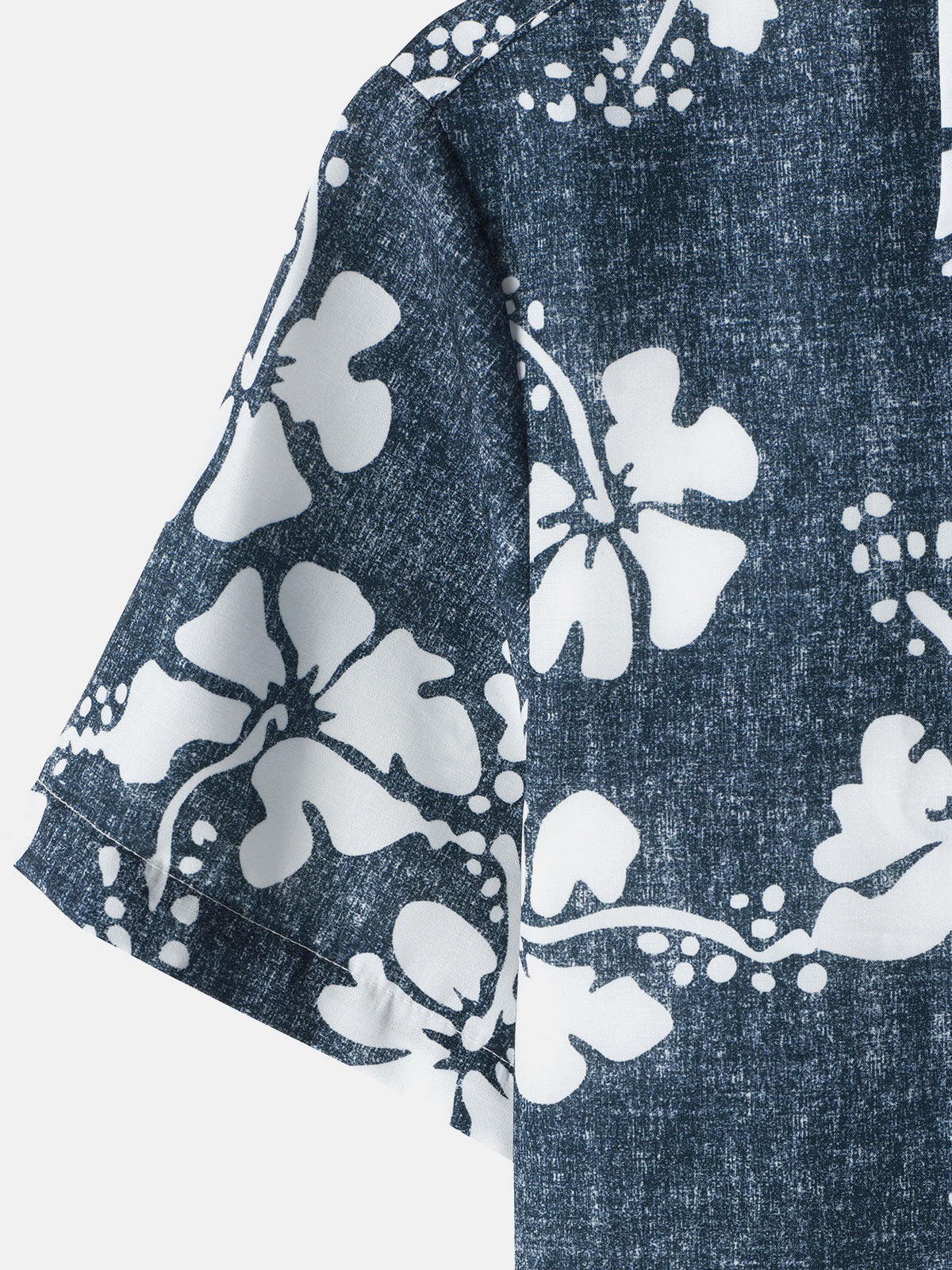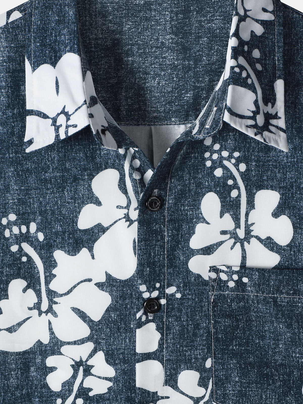Chemise à manches courtes boutonnée bleu marine avec poche hawaïenne florale pour hommes
