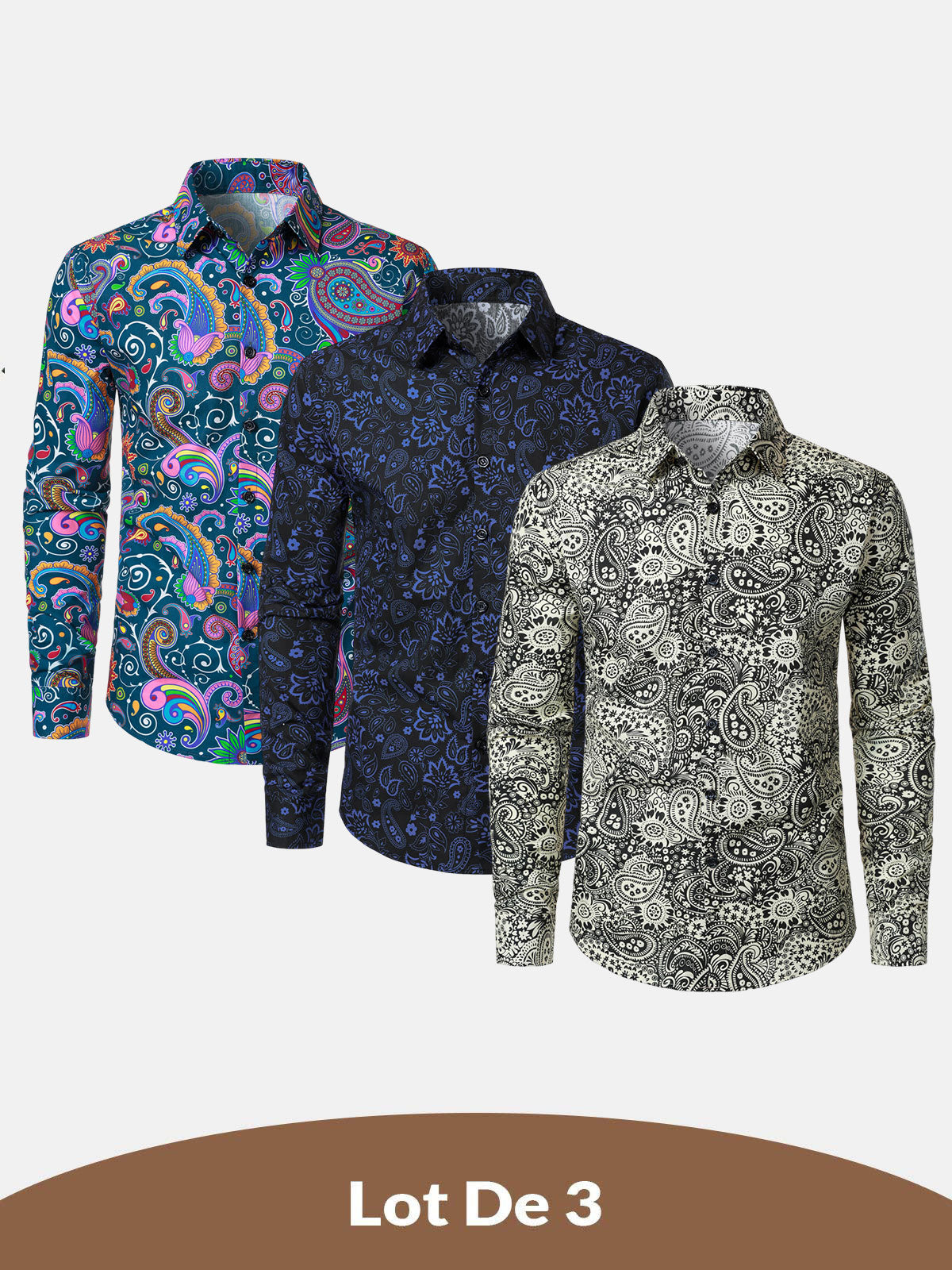 Lot de 3 | Chemises à manches longues en coton à imprimé cachemire vintage pour homme