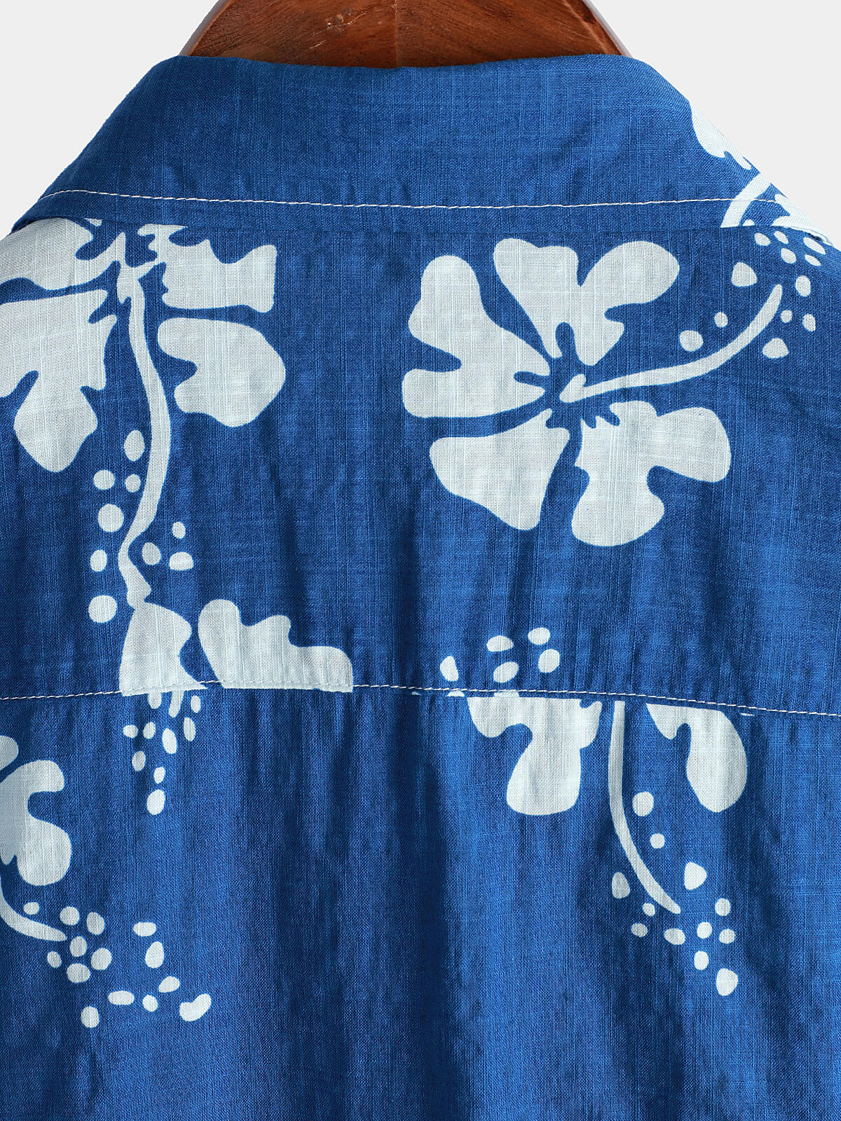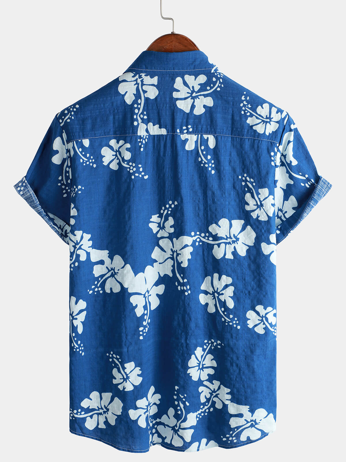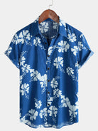 Chemise boutonnée hawaïenne tropicale bleue à manches courtes pour hommes