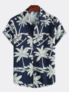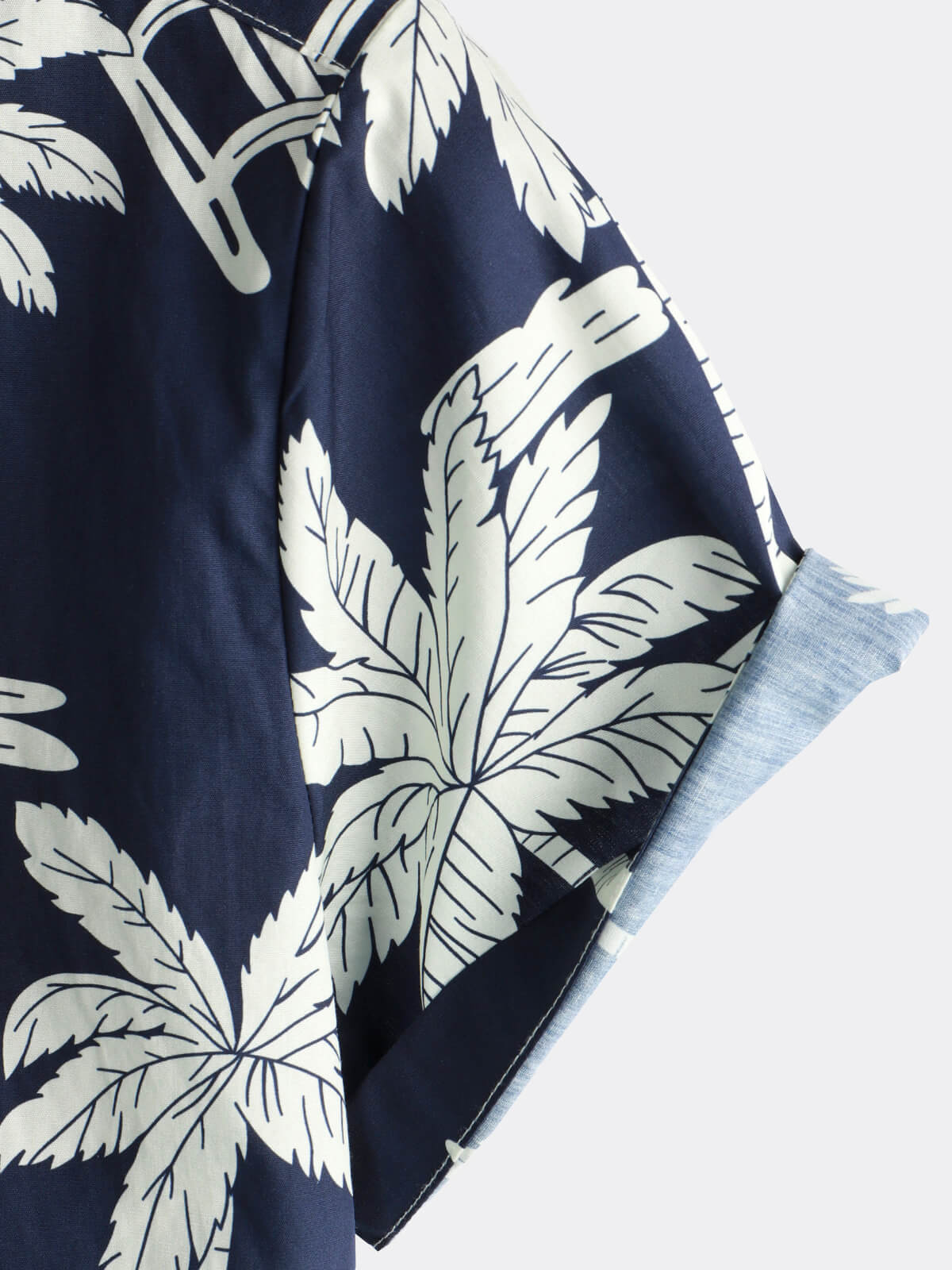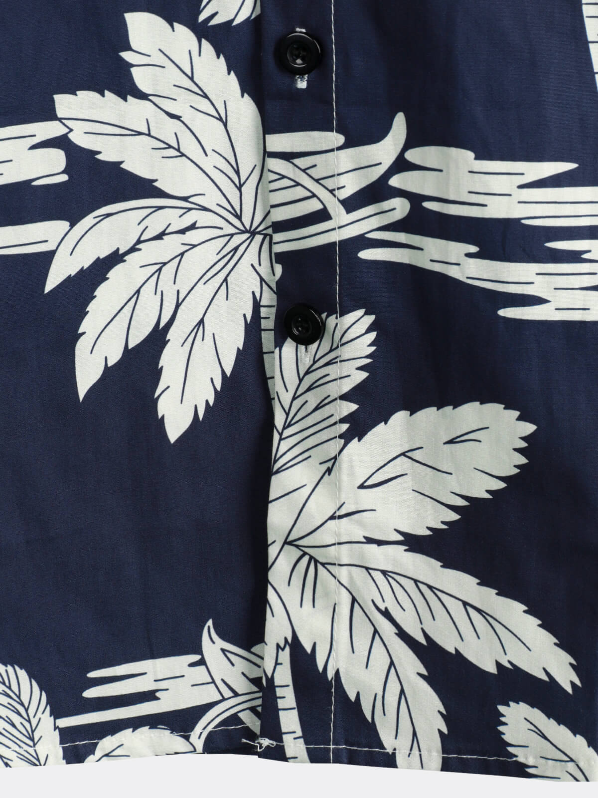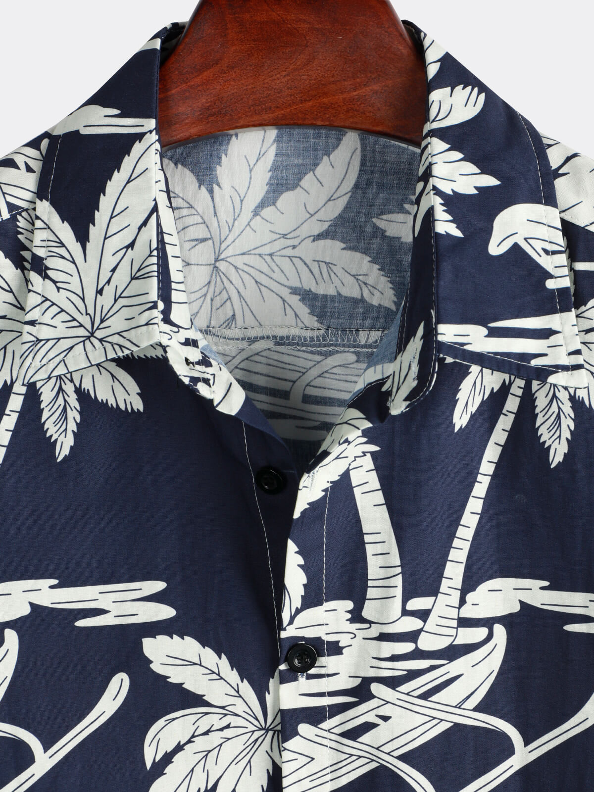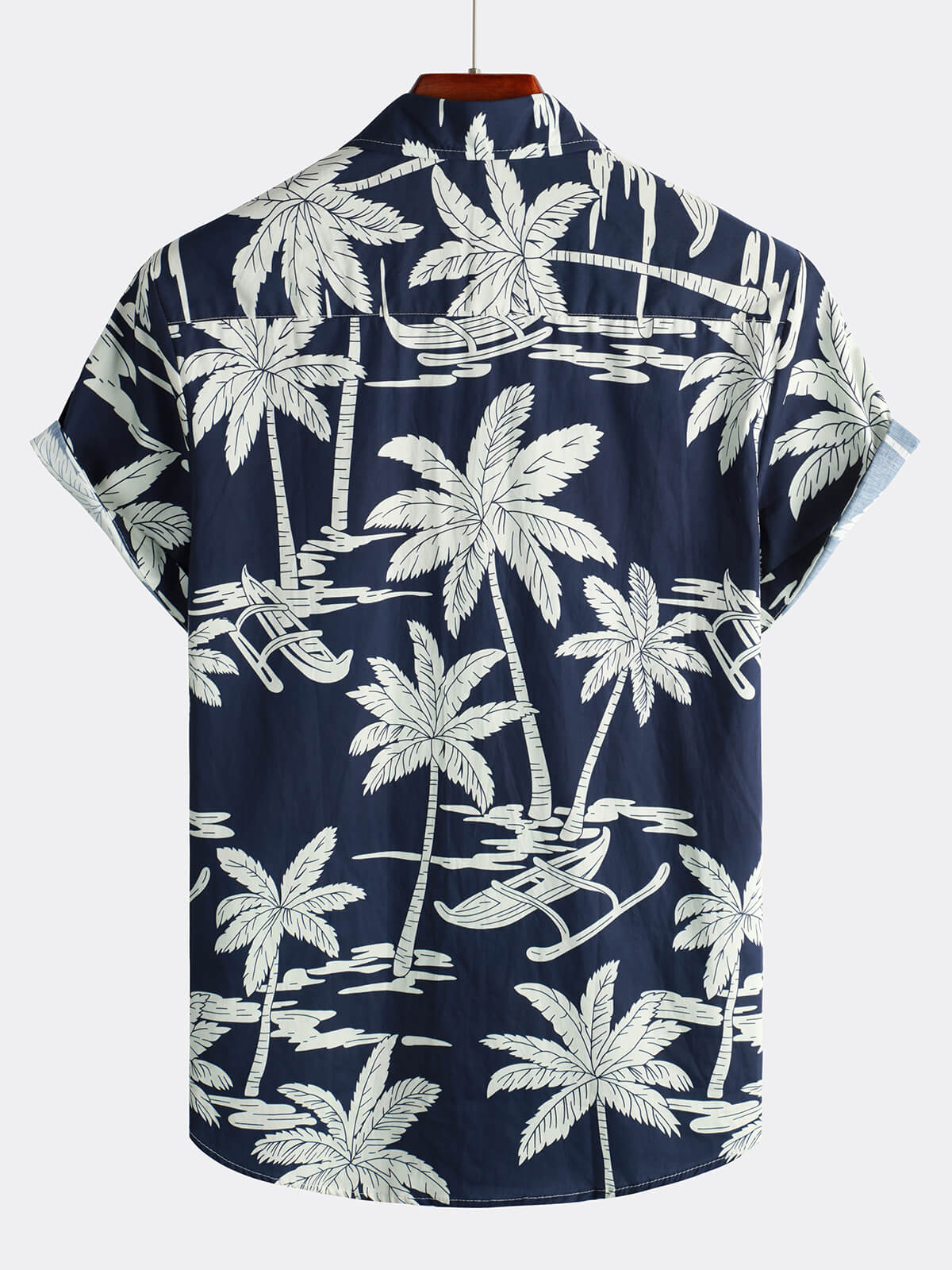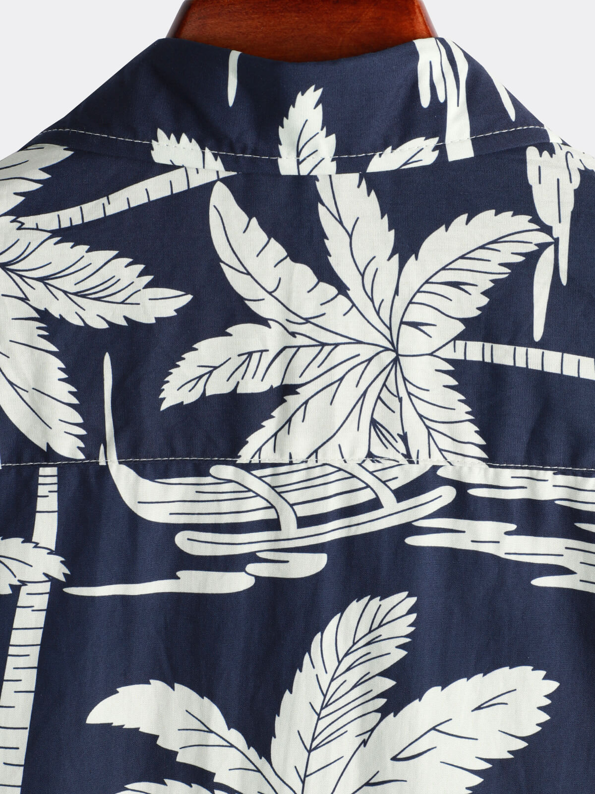 Chemise hawaïenne à manches courtes en coton imprimé palmier bleu marine pour homme