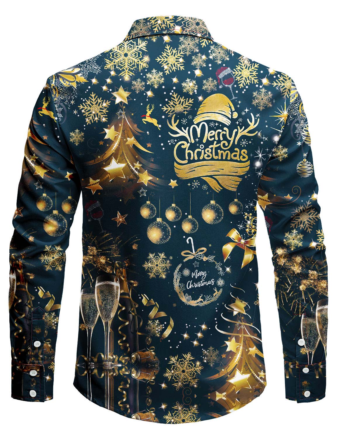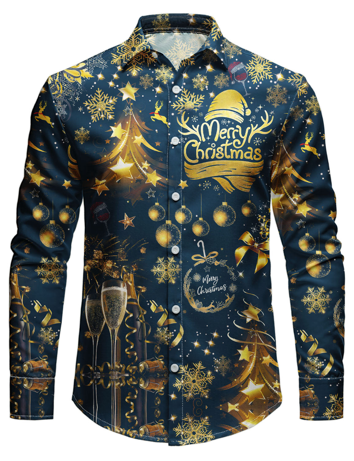 Chemise à manches longues bleu marine pour homme, imprimé champagne doré « Joyeux Noël »