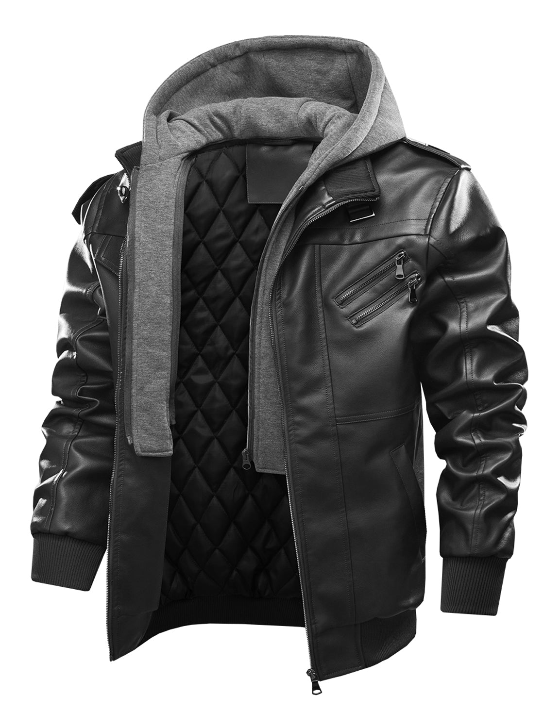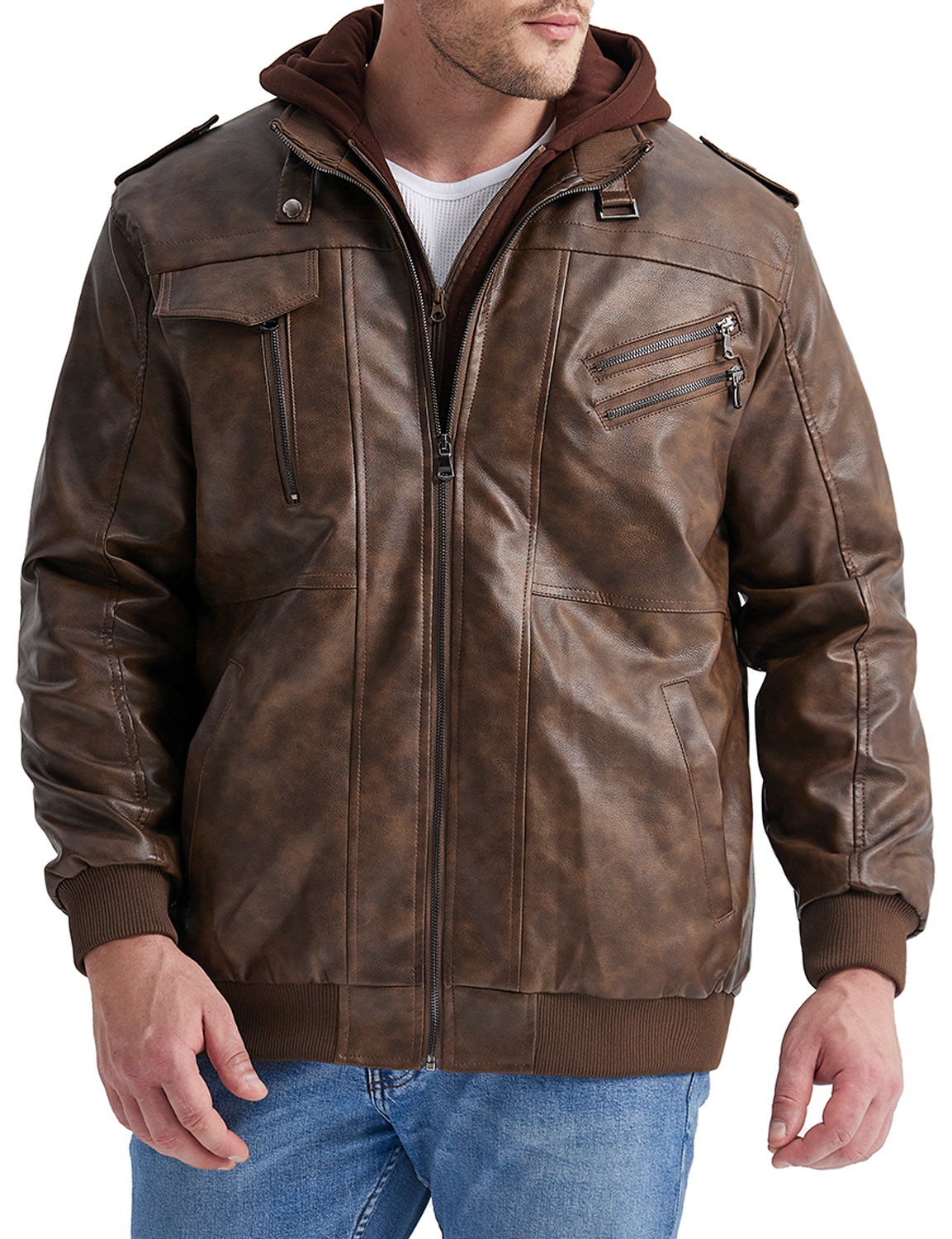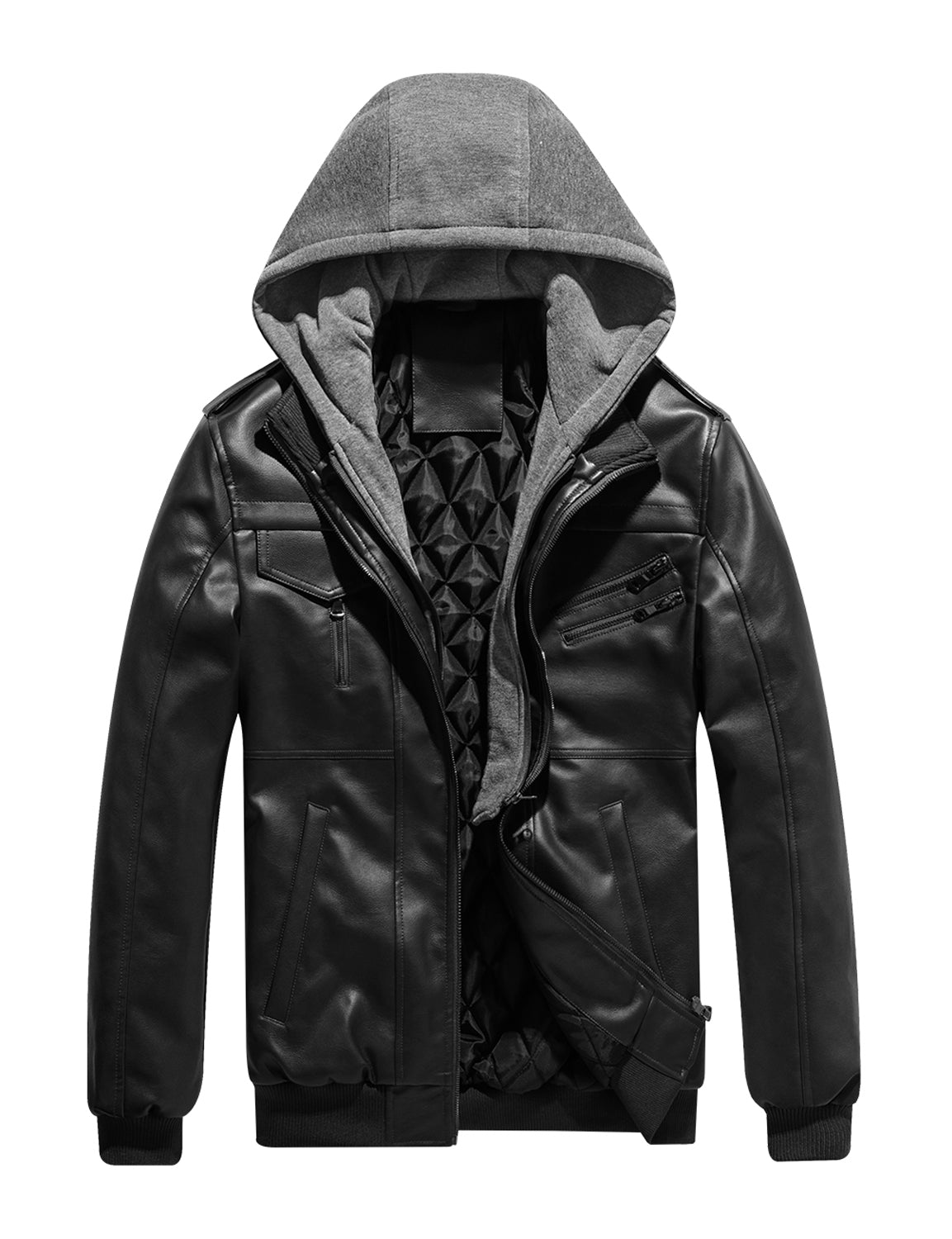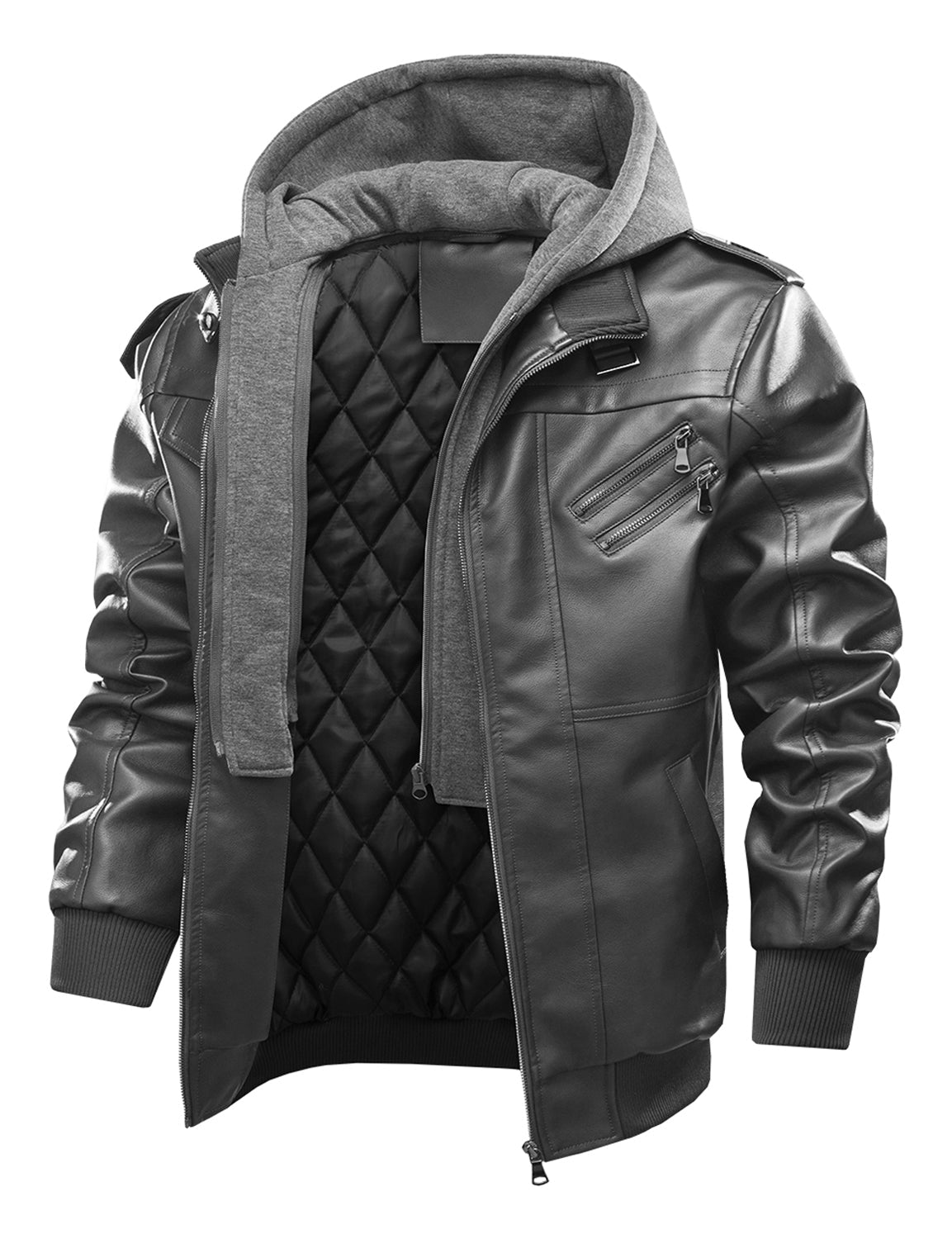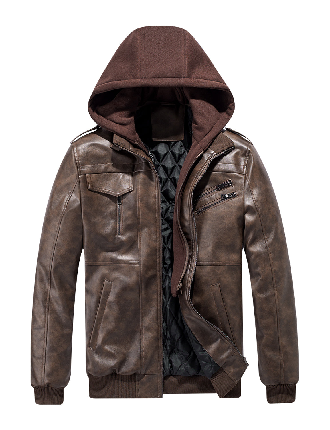 Veste de moto en cuir d'hiver pour motard vintage pour homme avec capuche amovible