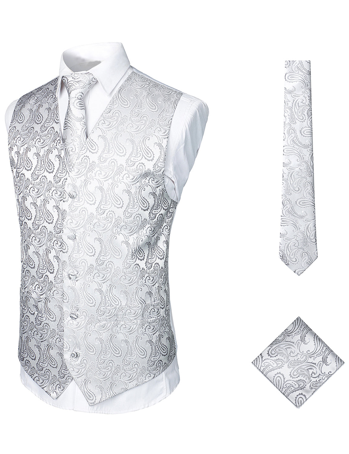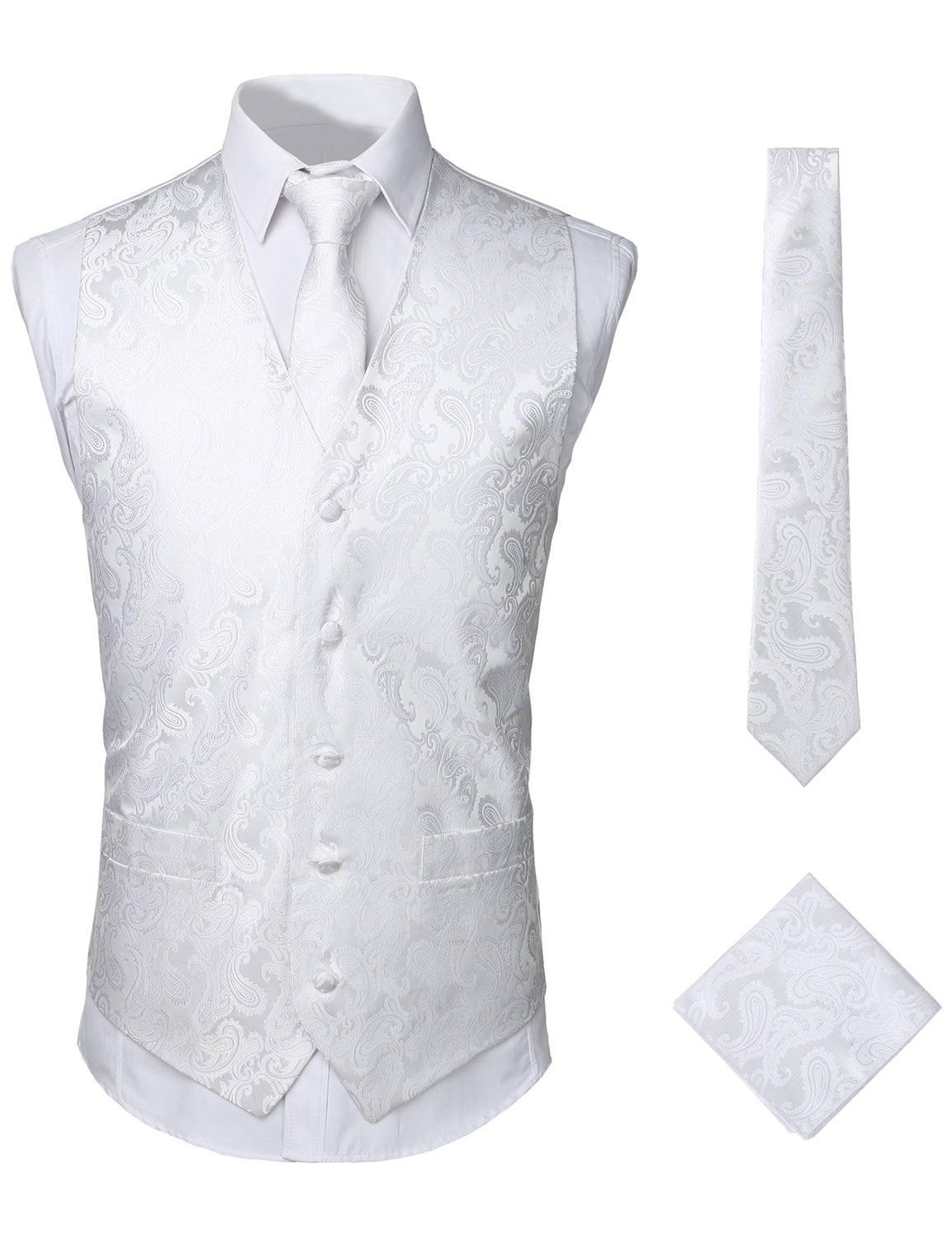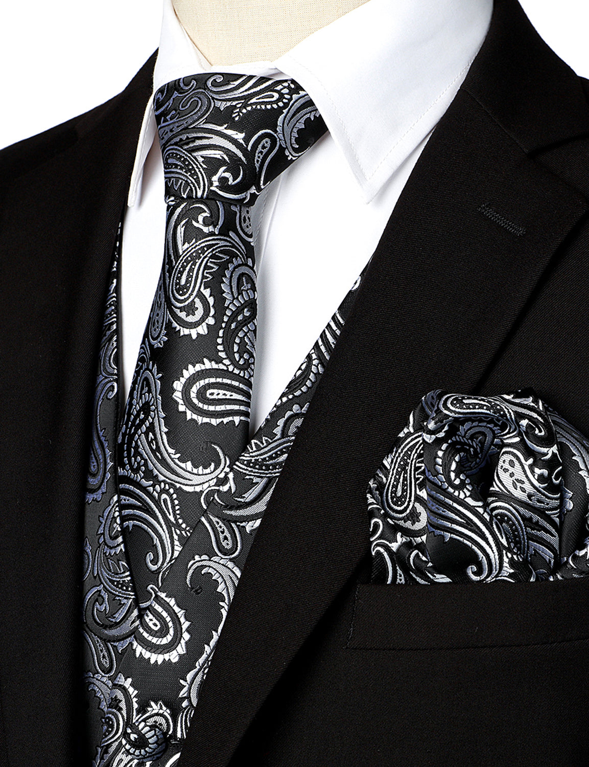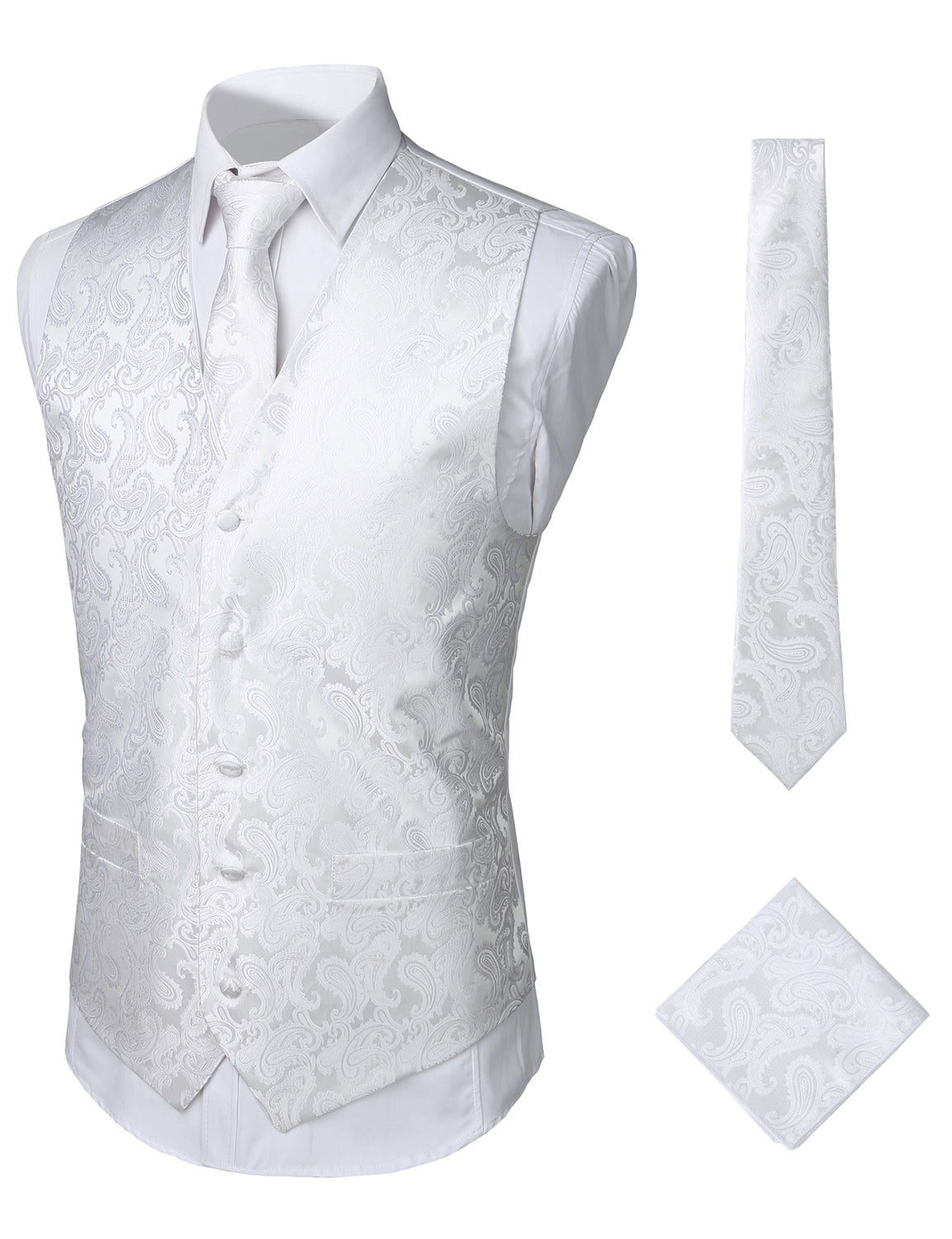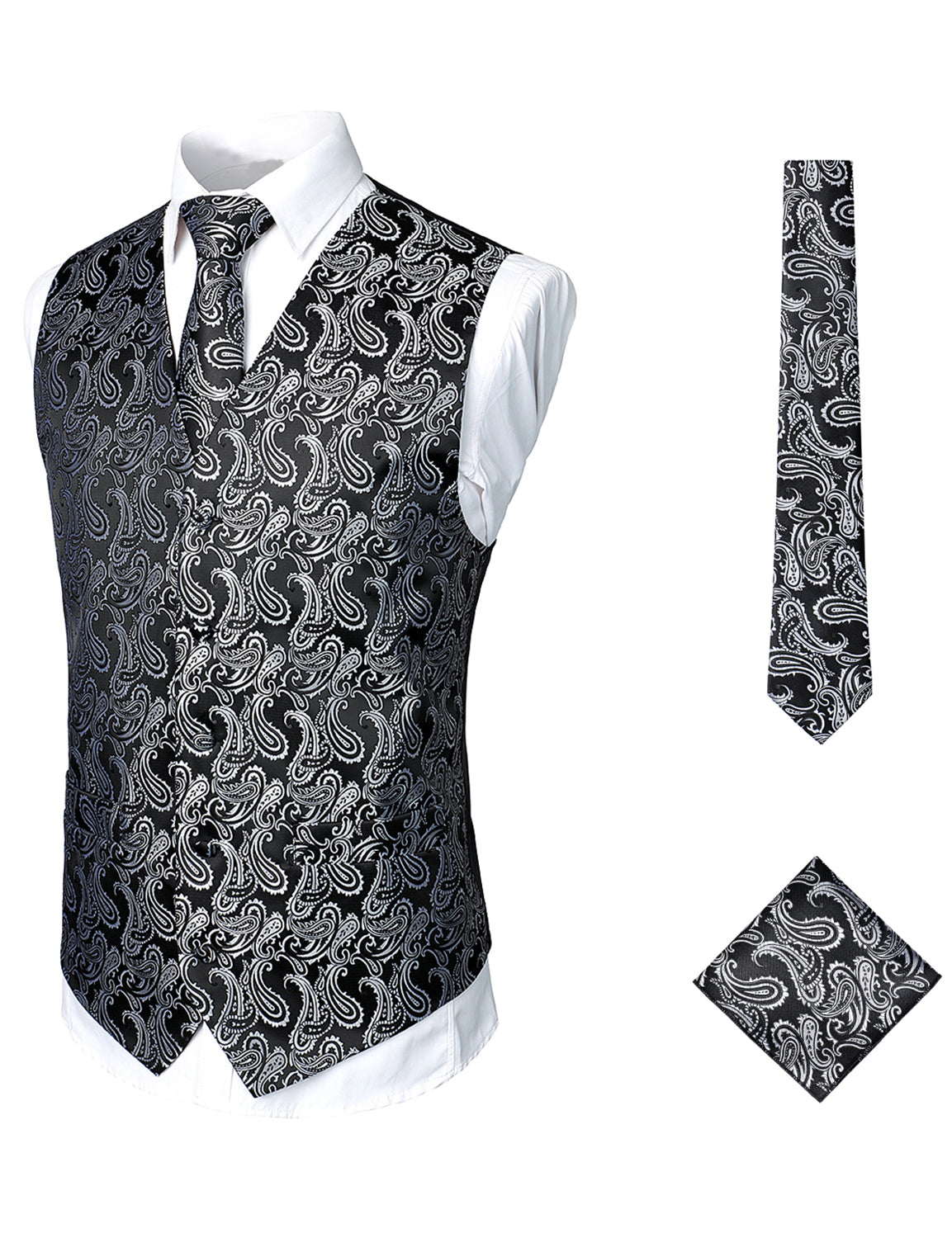 Men's 3pc Classic Jacquard Paisley Vest Set Necktie Pocket Square Waistcoat for Suit or Tuxedo