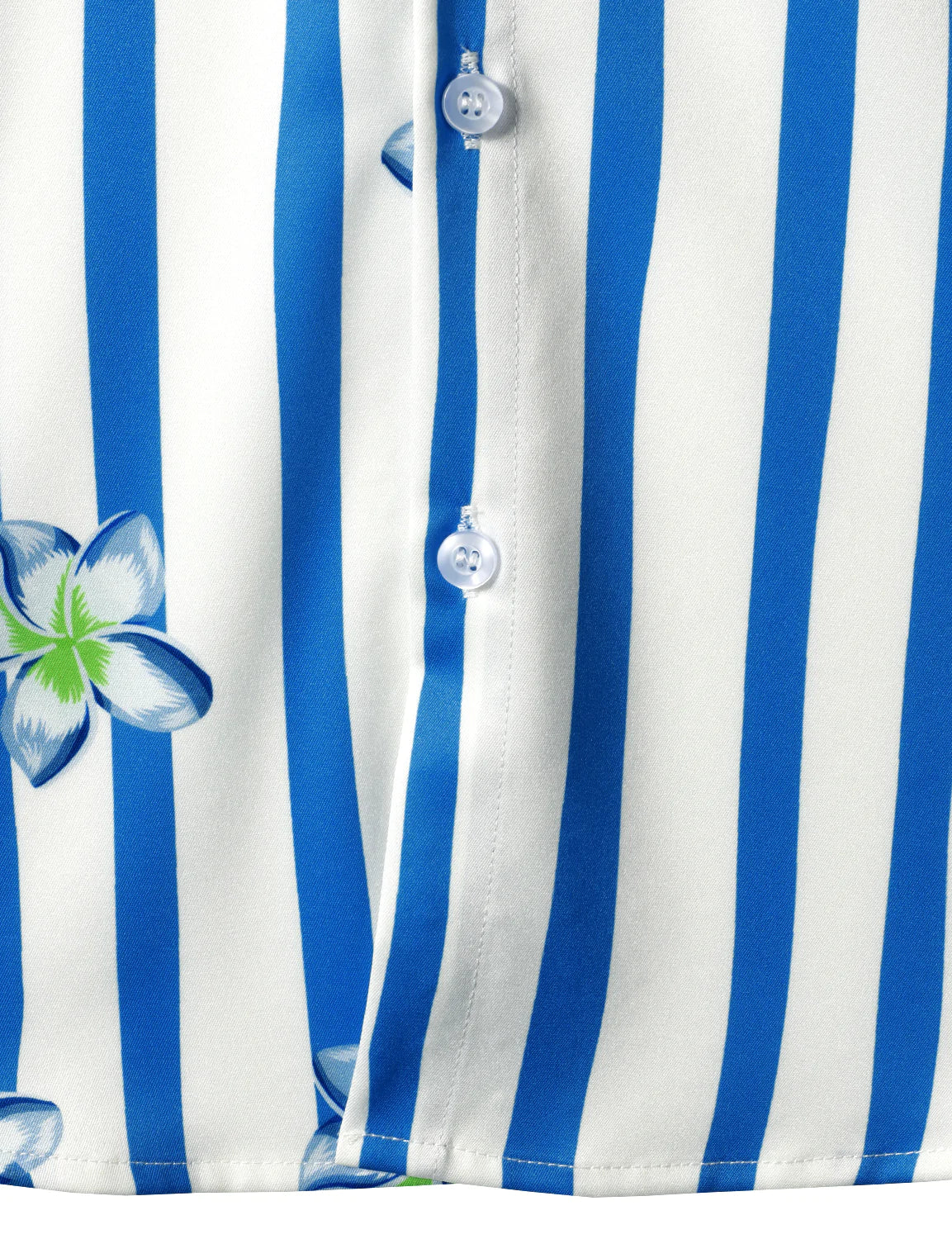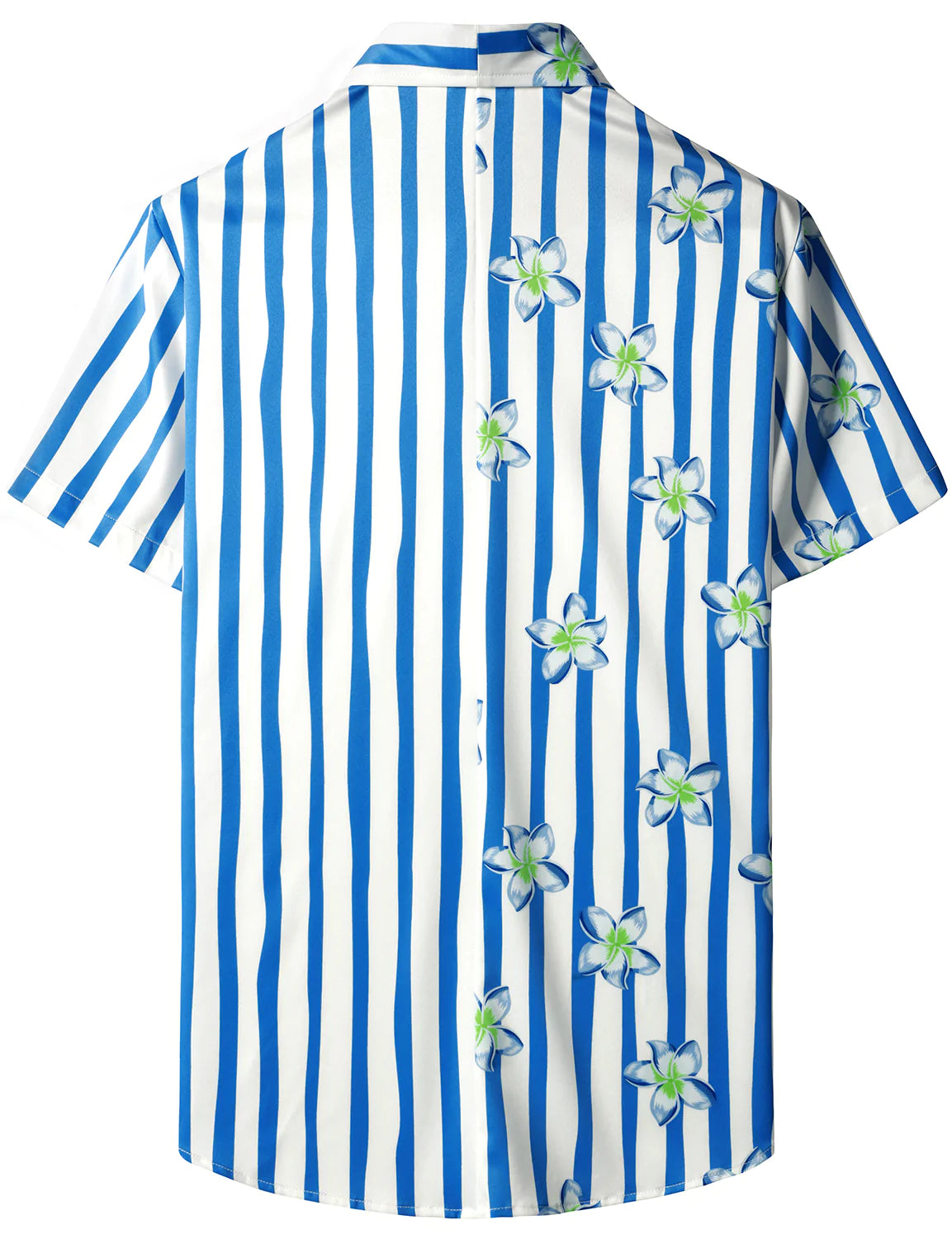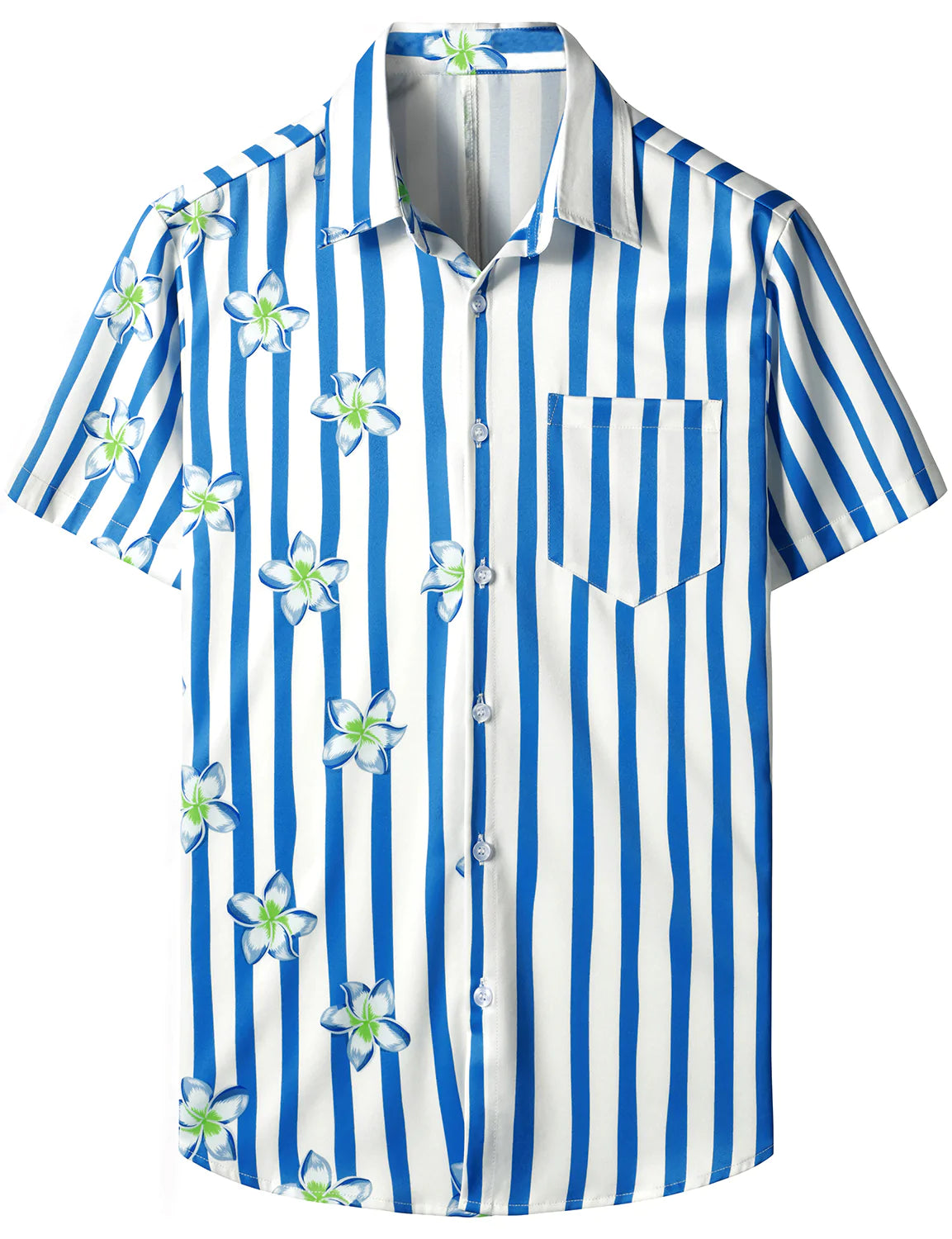 Chemise hawaïenne à manches courtes Aloha à imprimé floral bleu et blanc à rayures pour hommes