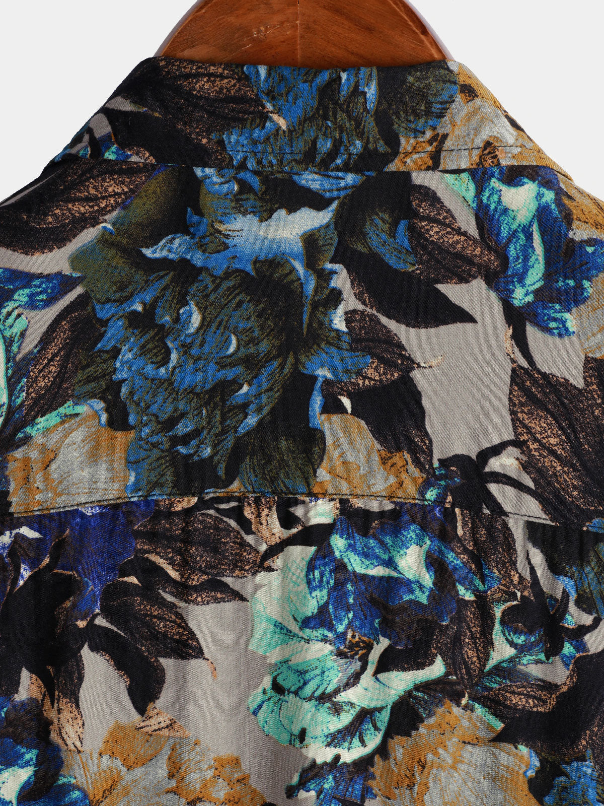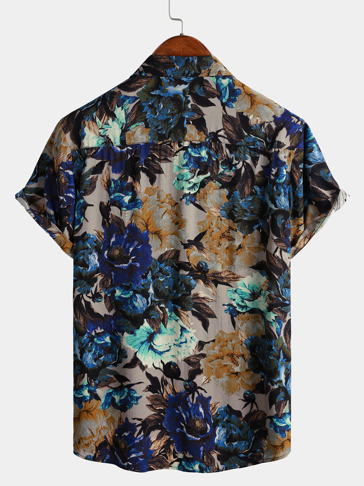 Chemise à manches courtes de vacances d'été bleu vintage à fleurs rétro pour hommes