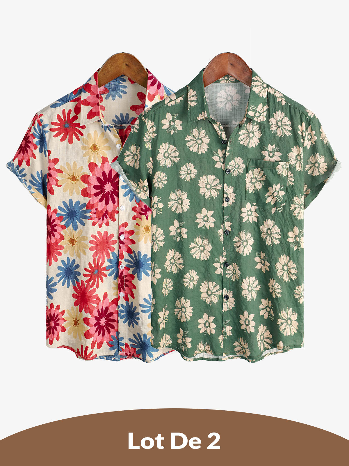 Lot de 2 | Chemises d'été de vacances à boutons à manches courtes hawaïennes florales pour hommes
