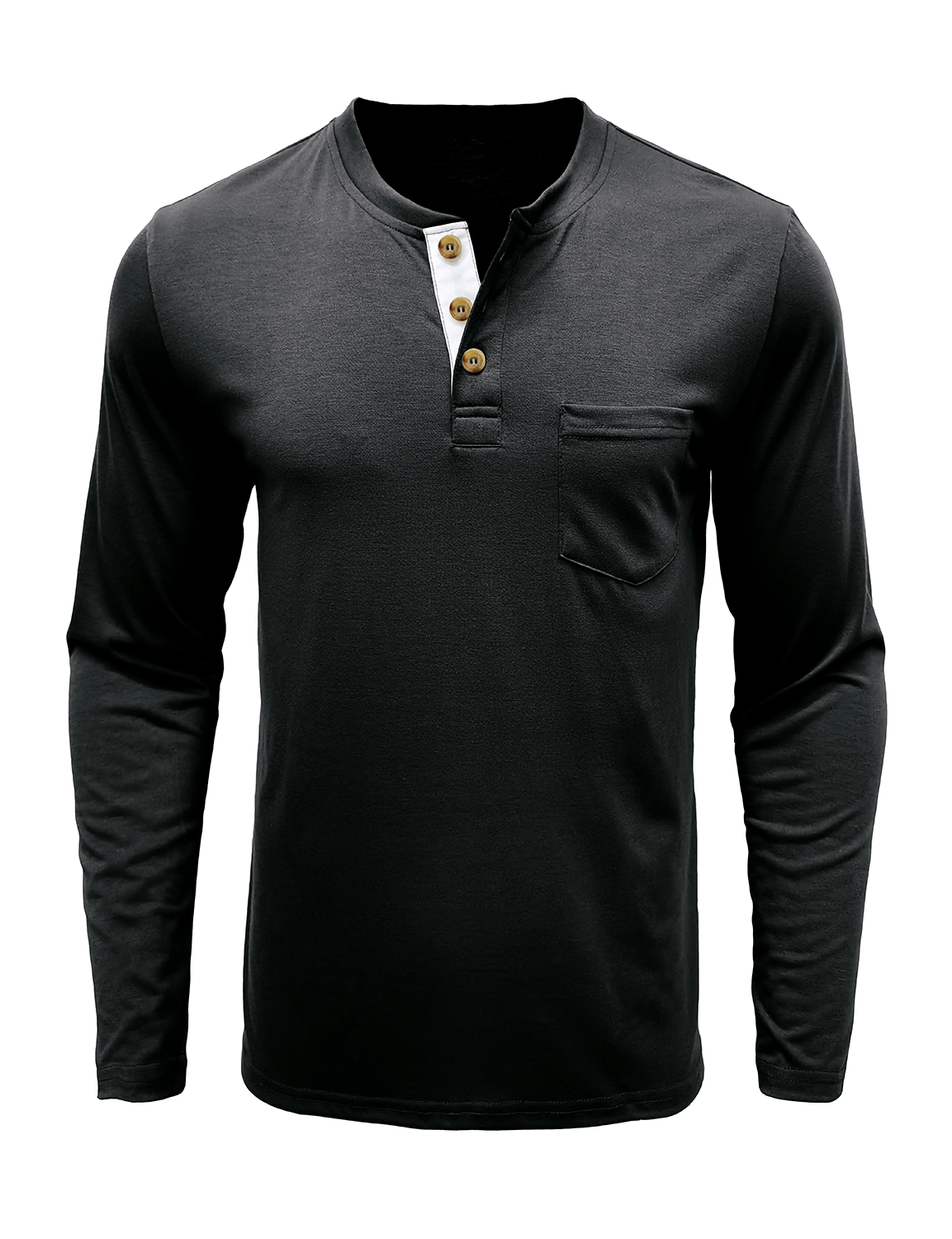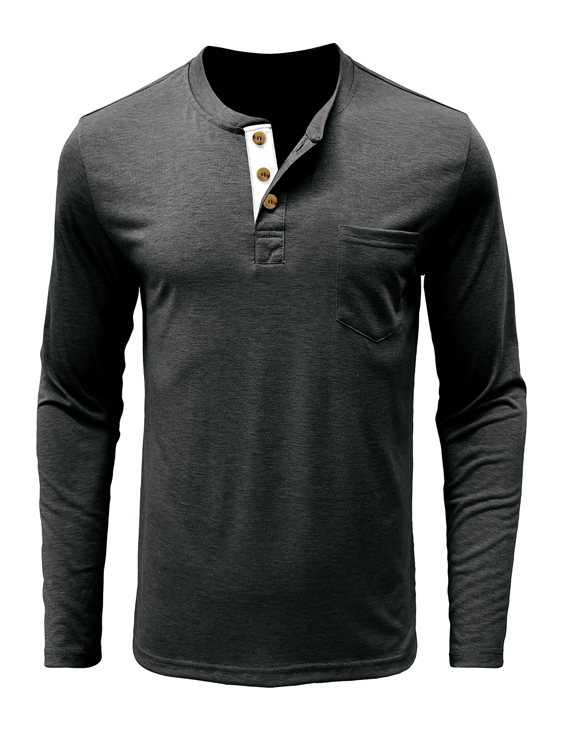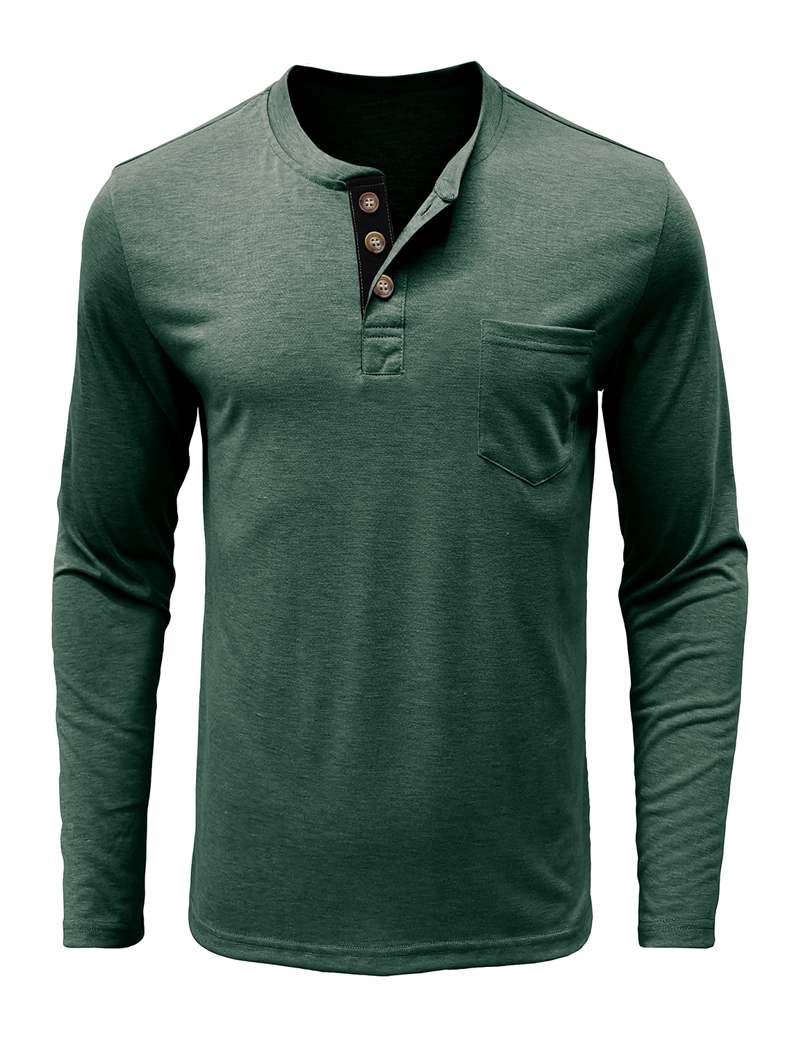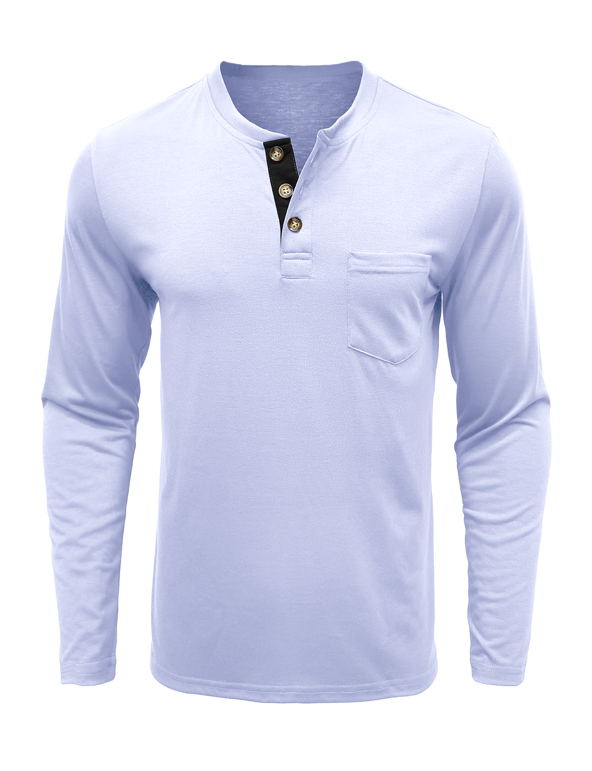 T-shirt décontracté à manches longues et poche à col Henry en coton de couleur unie pour hommes