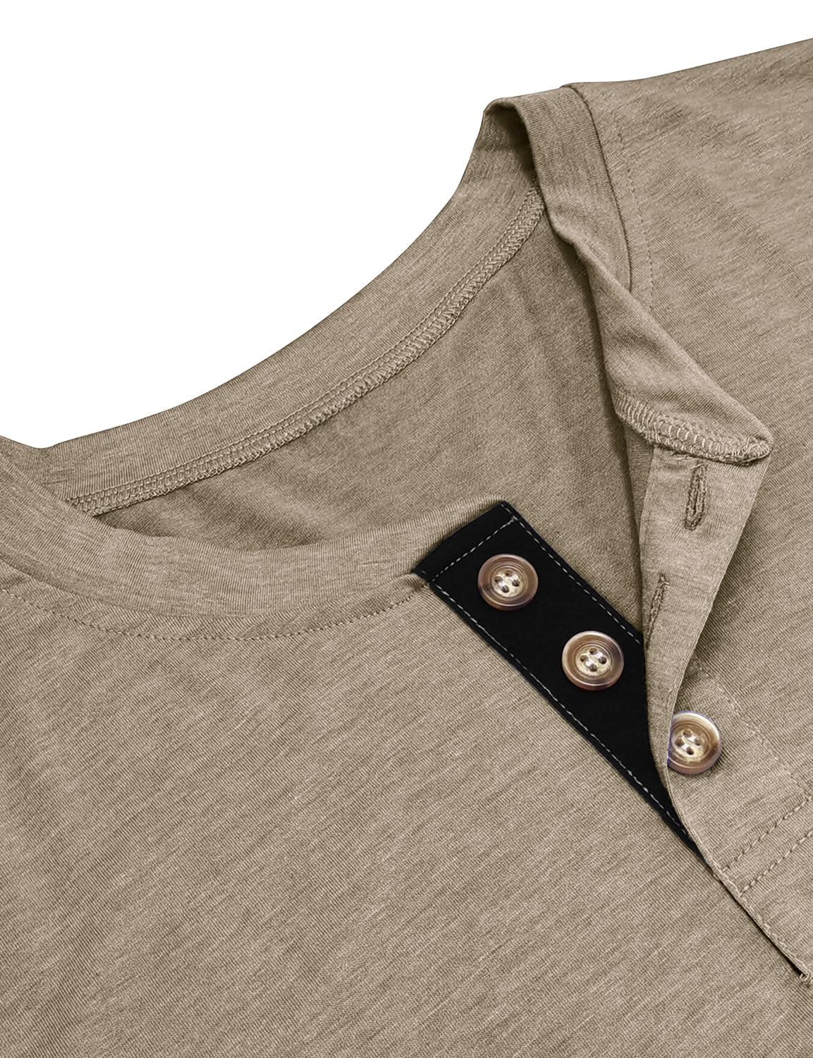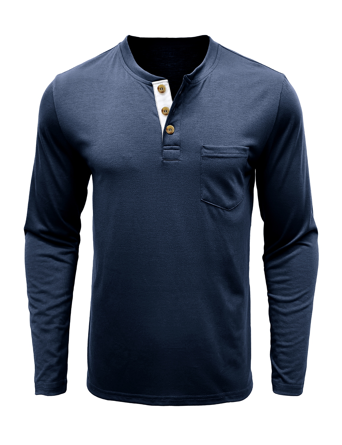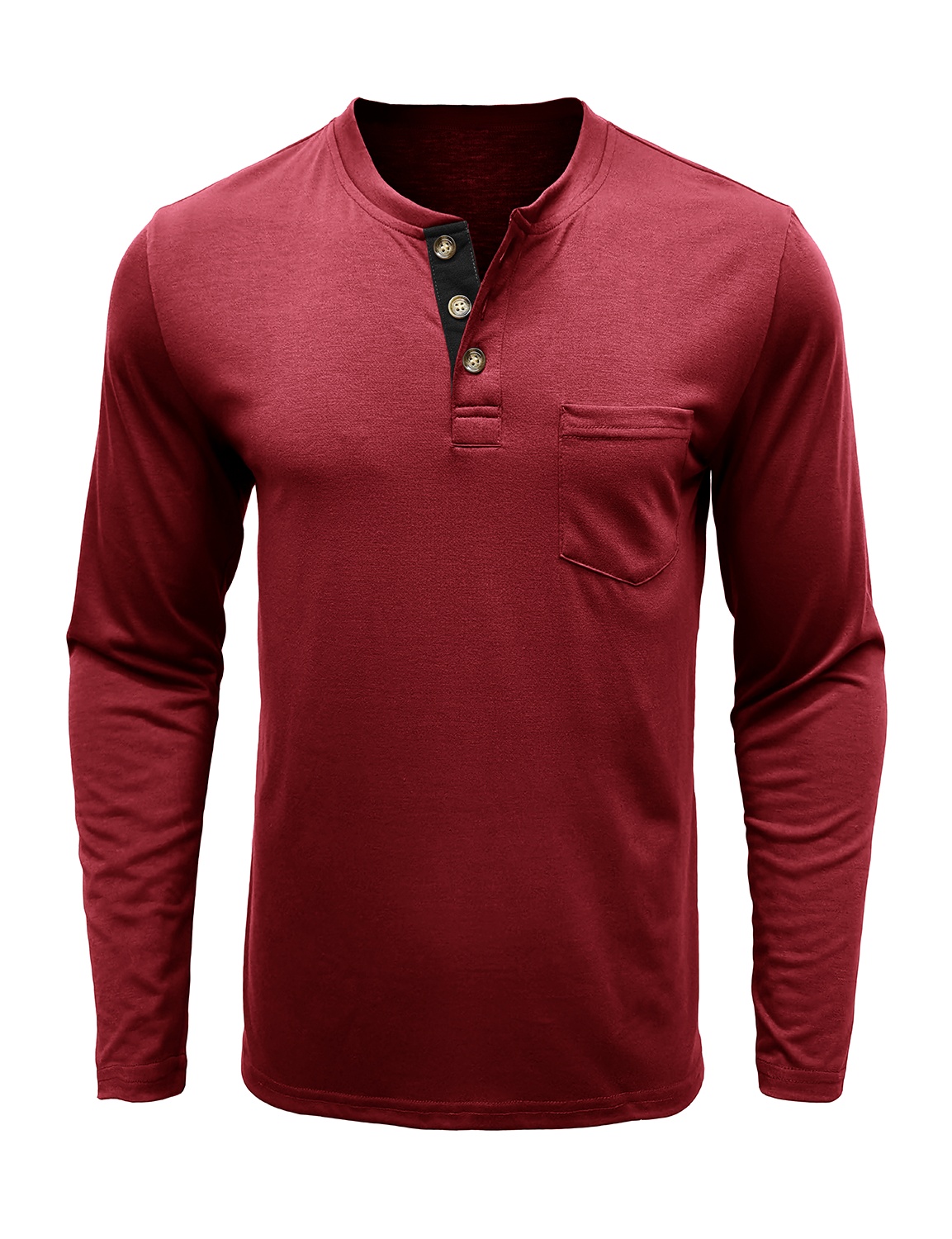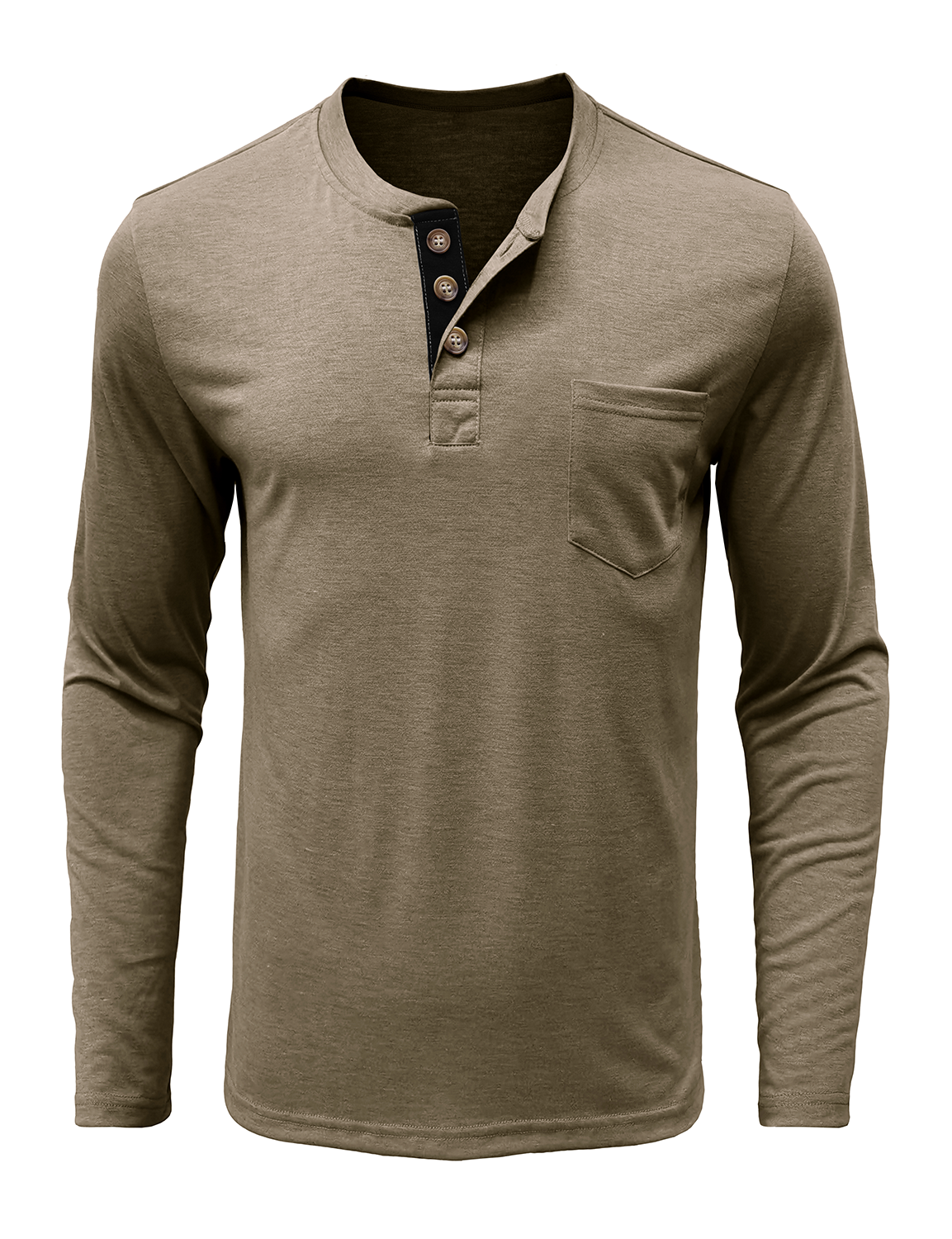 T-shirt décontracté à manches longues et poche à col Henry en coton de couleur unie pour hommes