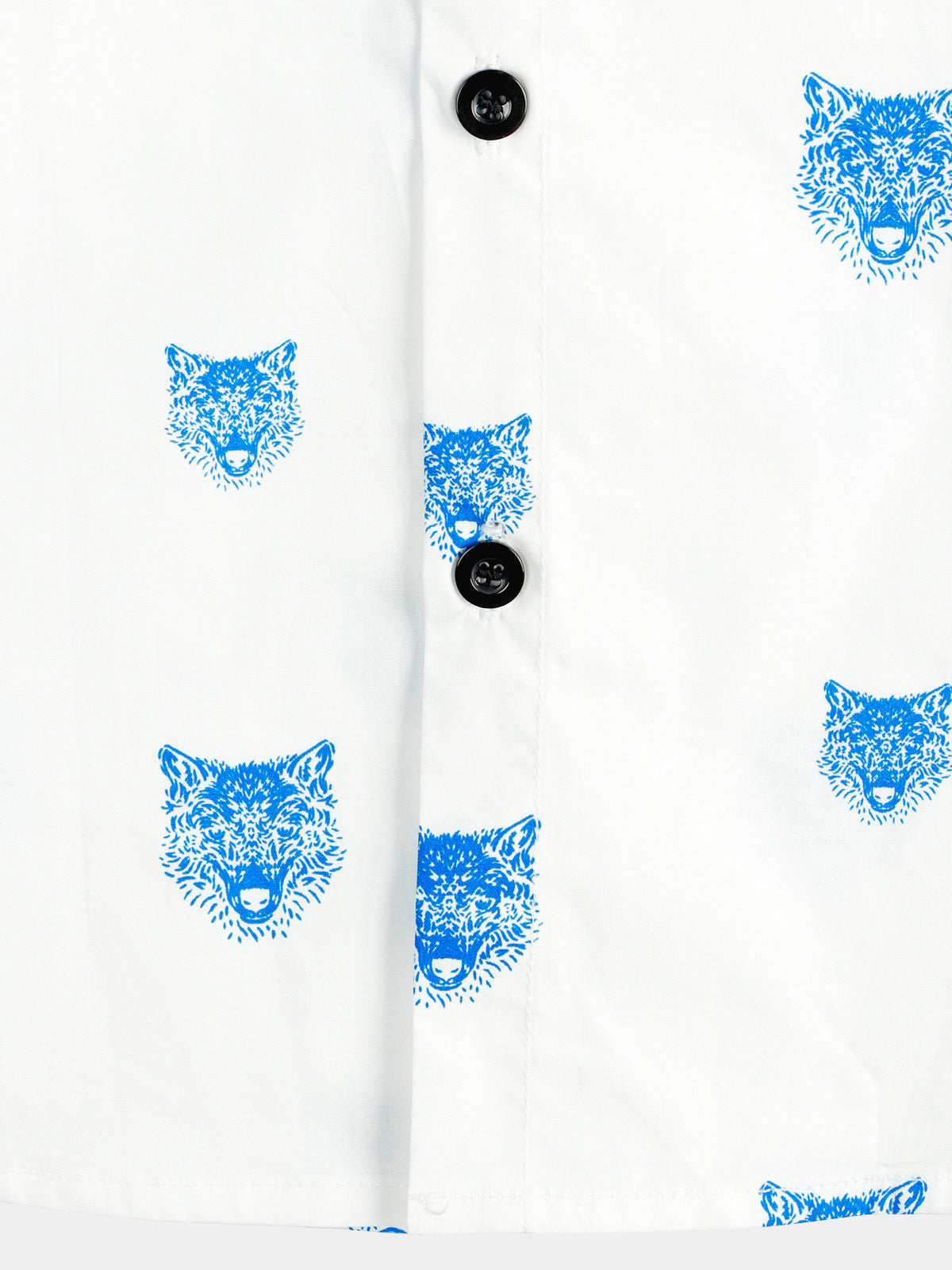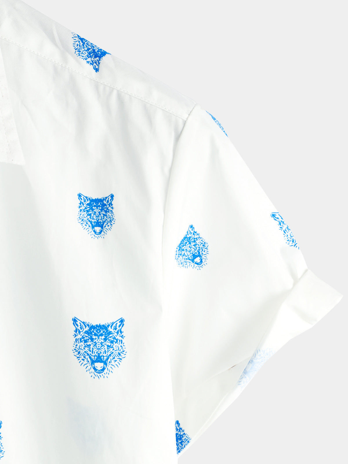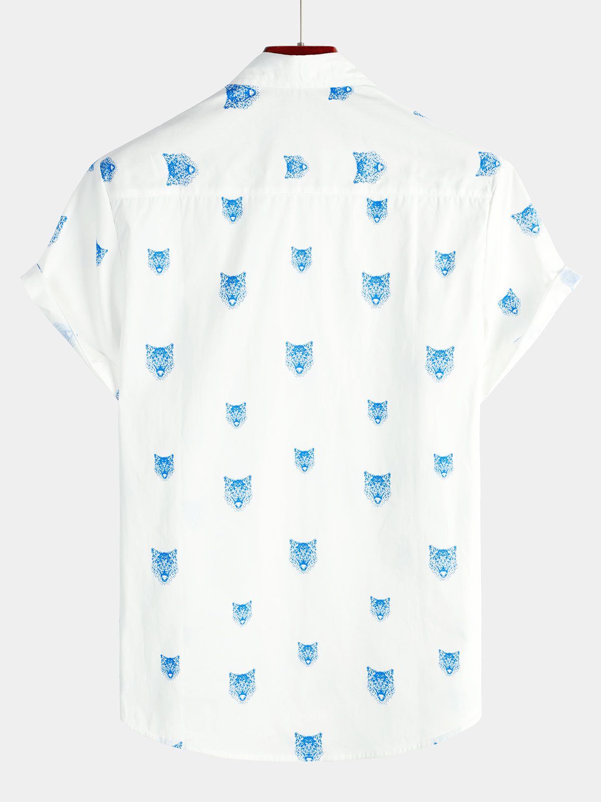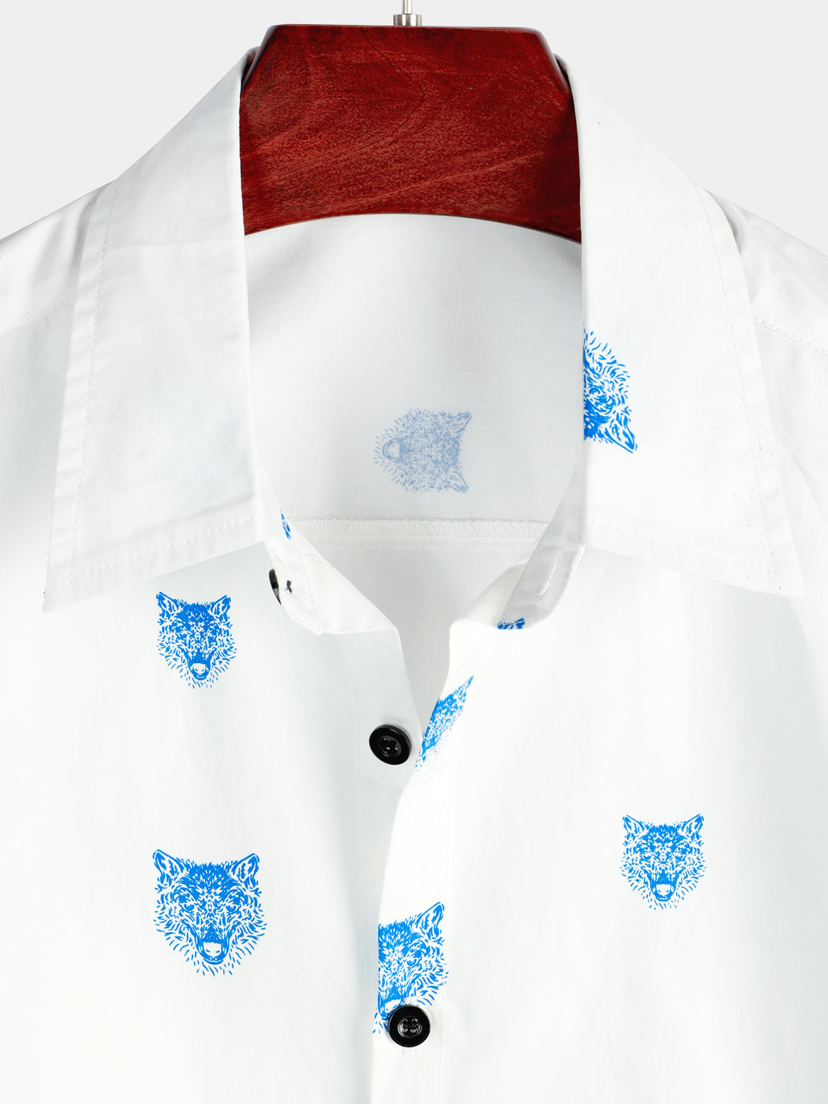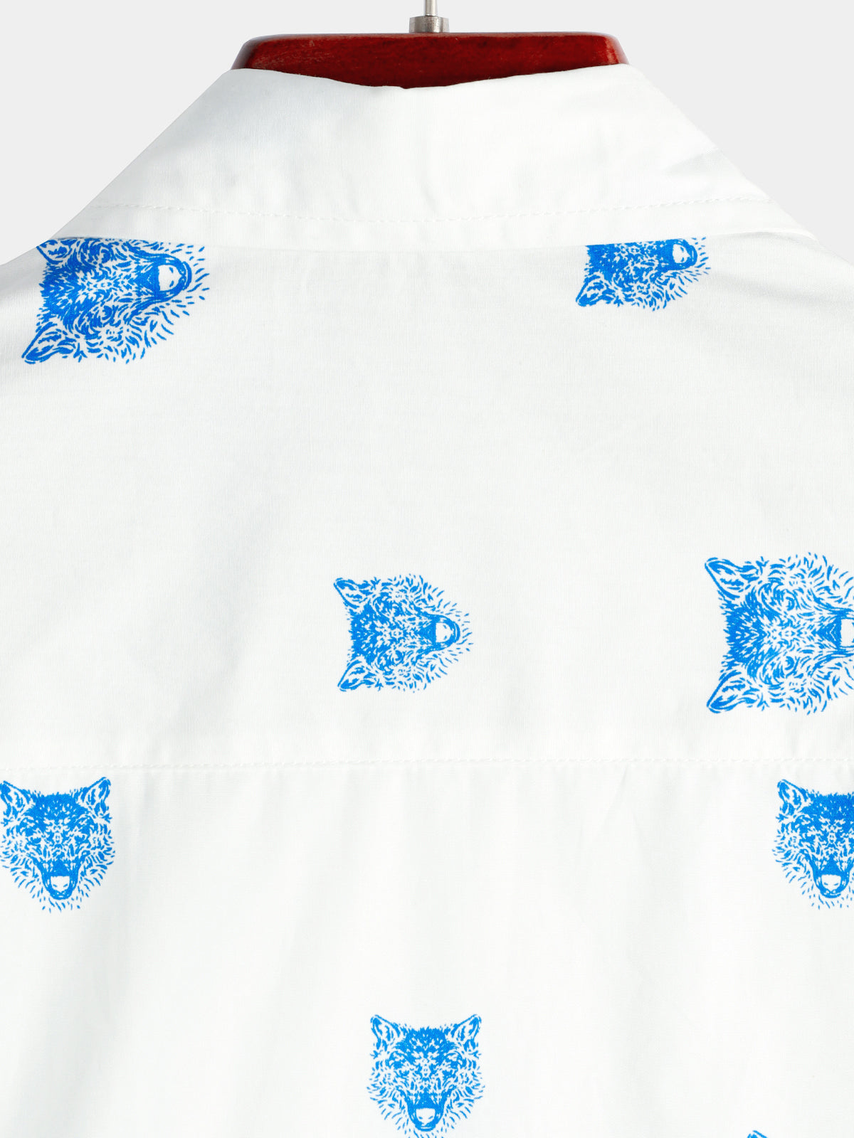 Chemise à manches courtes blanche à revers décontracté pour hommes avec imprimé animal loup