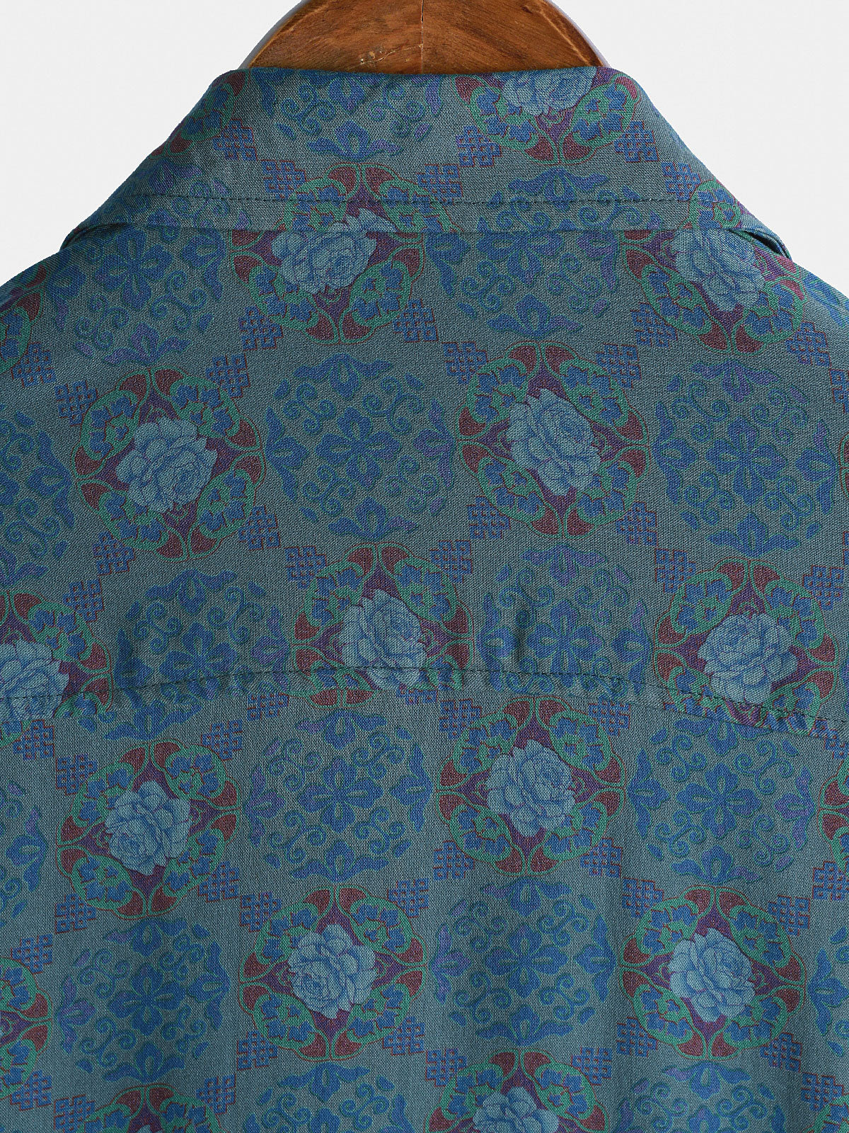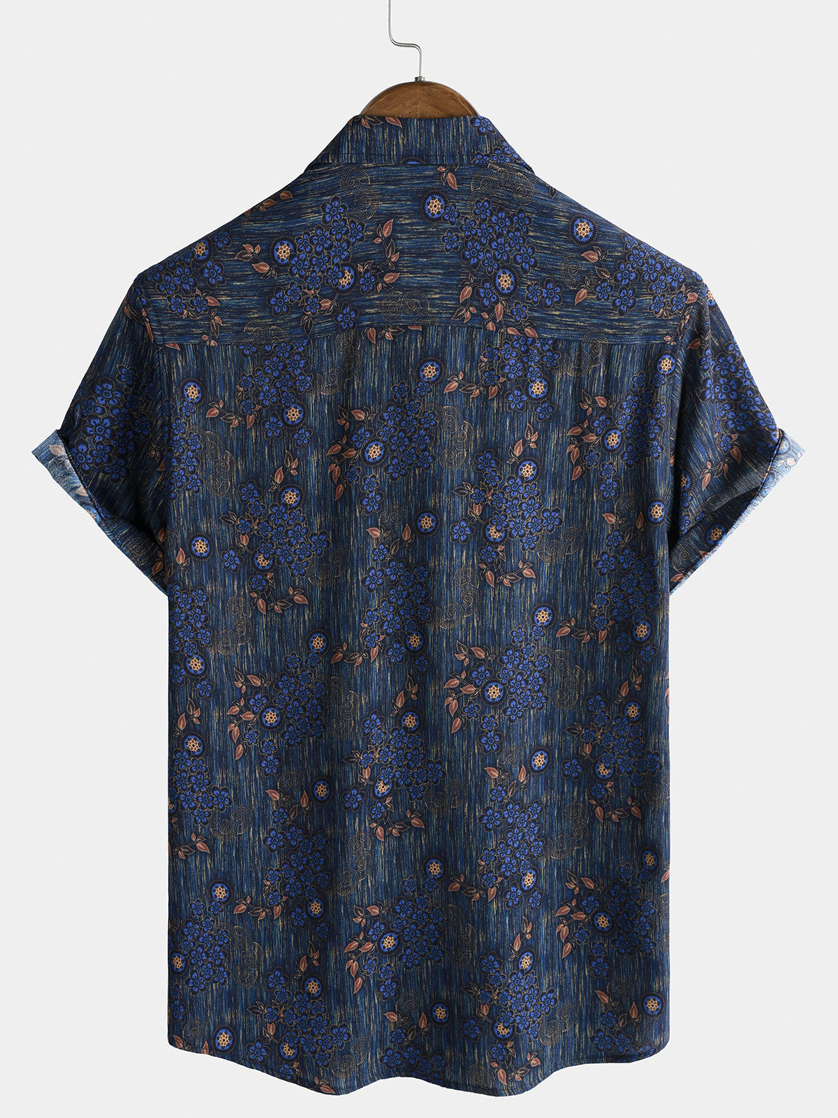 Chemise Homme Vintage Bleue à Imprimé Floral Manches Courtes