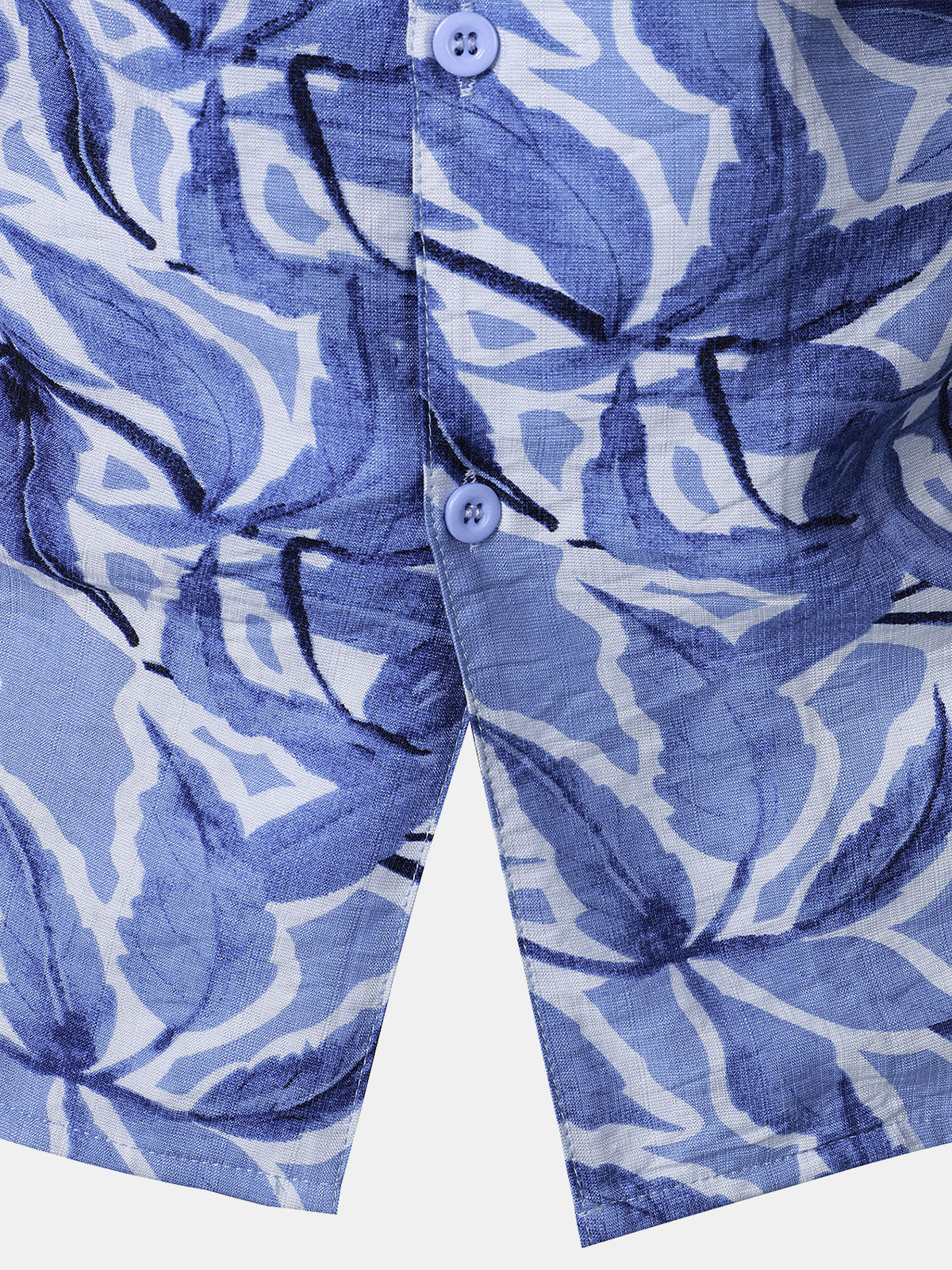 Chemise Homme à Boutons Manches Courtes à Imprimé Feuilles Tropicales Bleu avec Poche Style Hawaïen Col Cubain