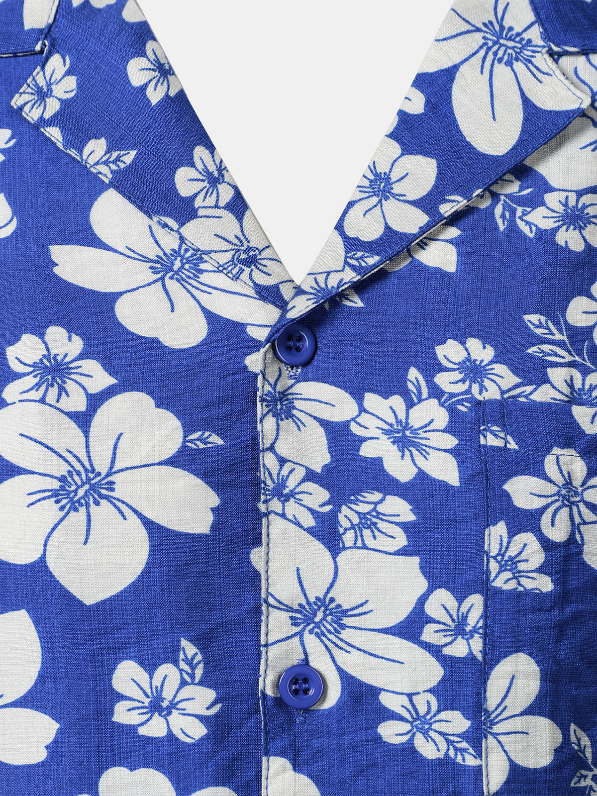 Chemise Homme à Boutons Manches Courtes à Imprimé Floral Bleu avec Poche Style Hawaïen Col Cubain