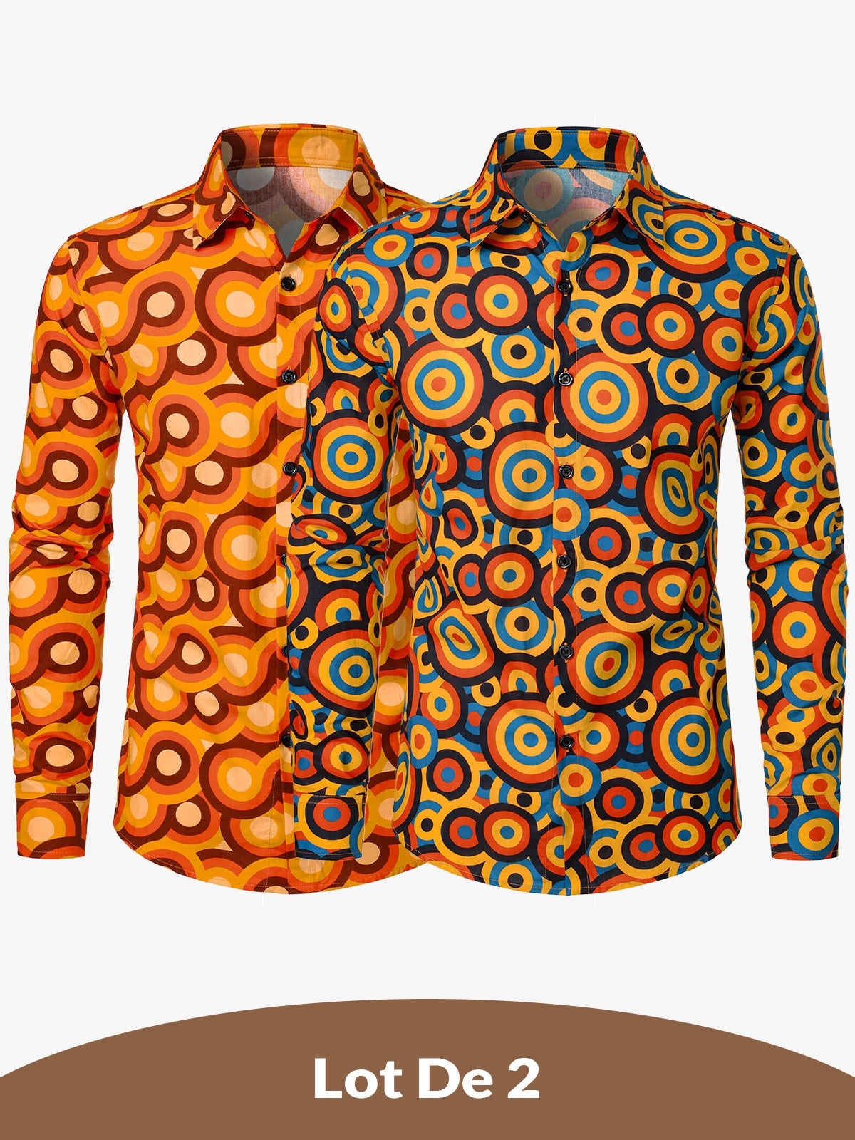 Lot de 2 | Chemises à manches longues à boutons rétro orange des années 70 pour hommes, style vintage géométrique