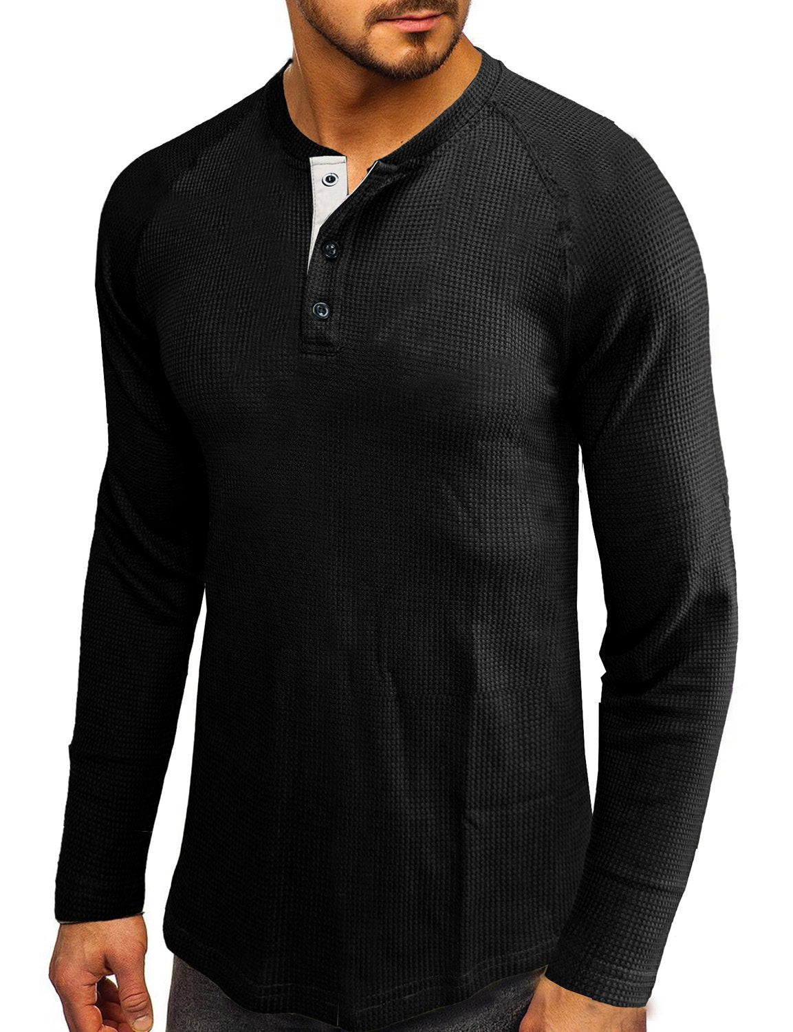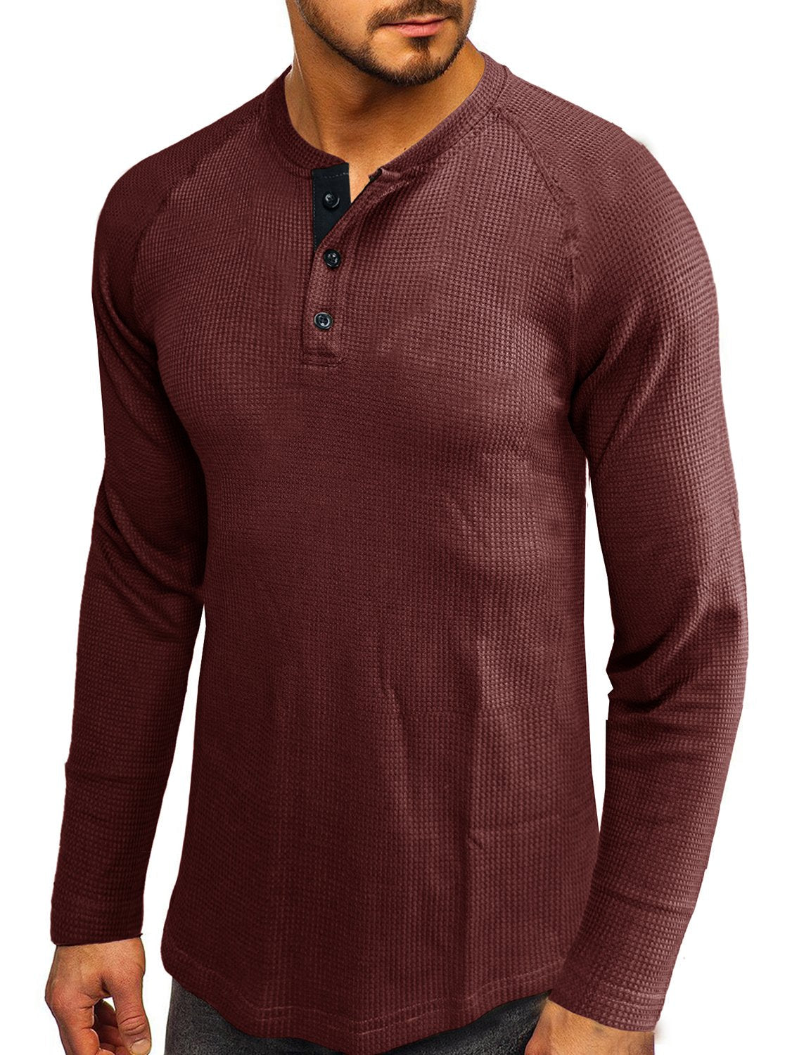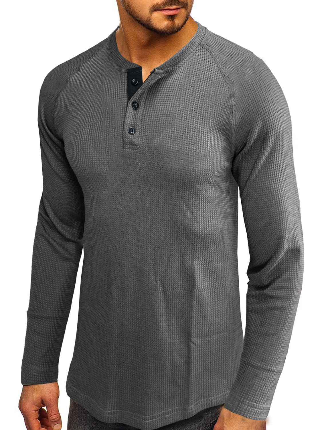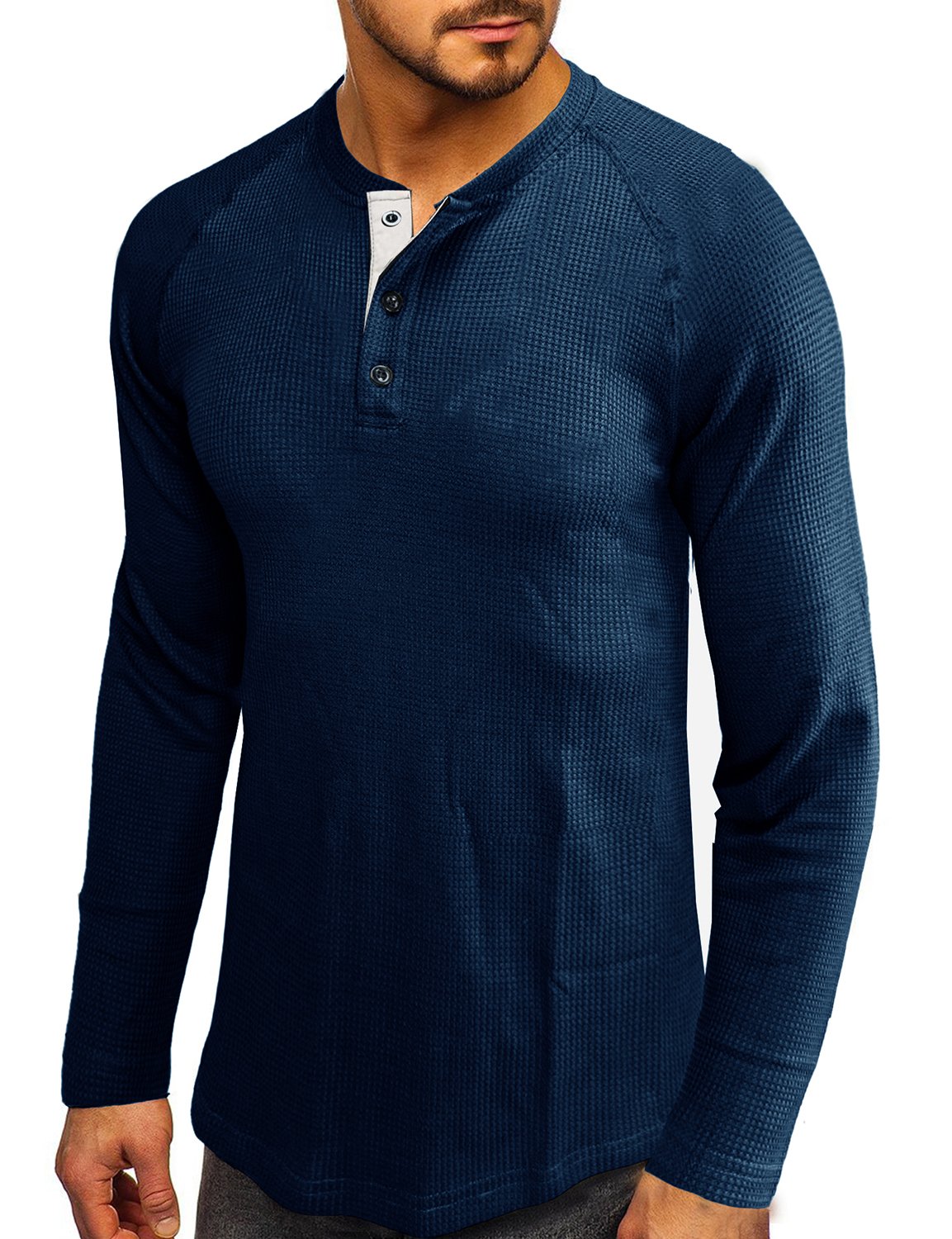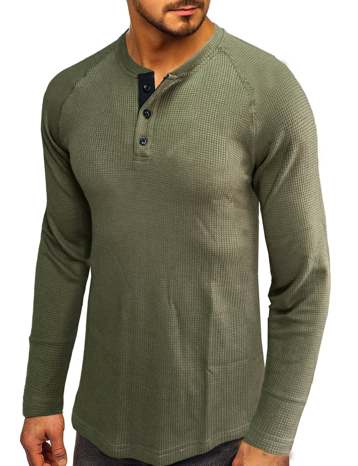 T-shirt décontracté à manches longues et poche à col Henry en coton de couleur unie pour hommes