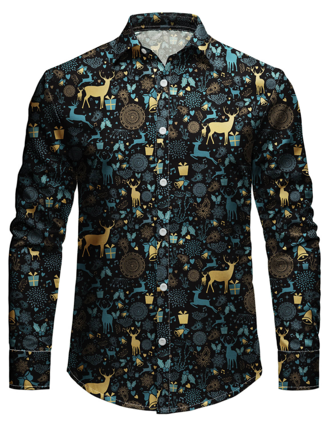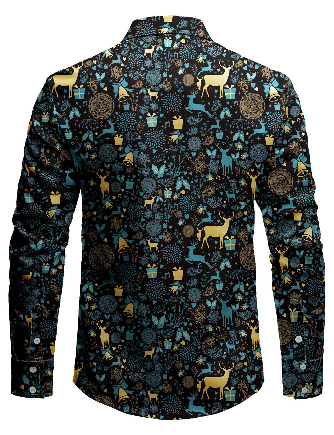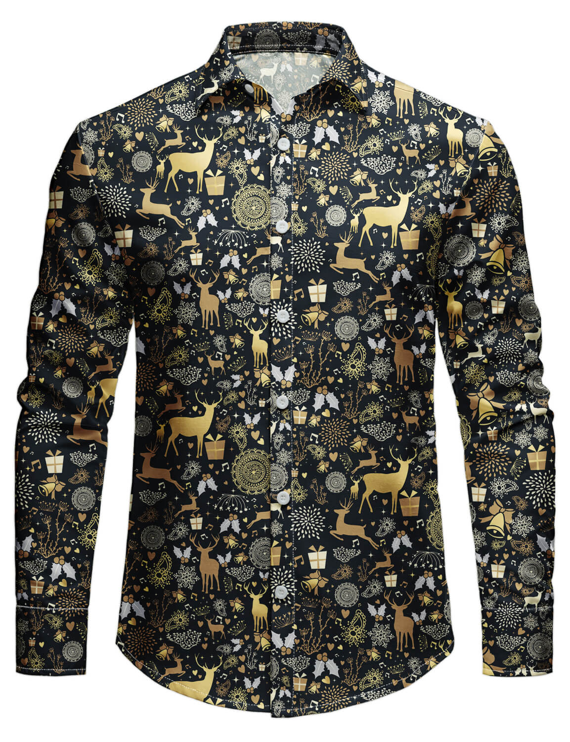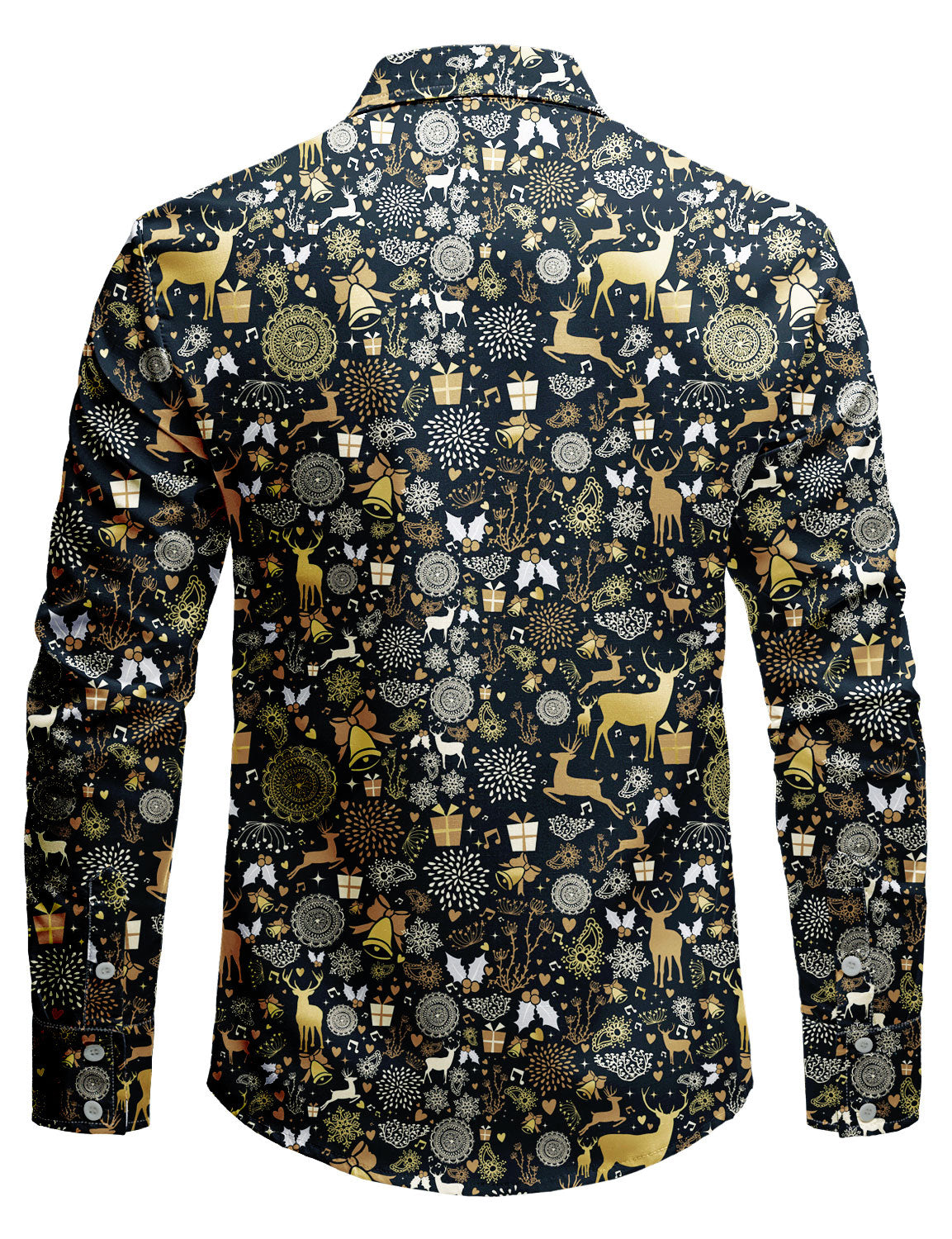 Chemise à manches longues boutonnée pour homme, motif rennes dorés brillants, idéale pour les fêtes de Noël