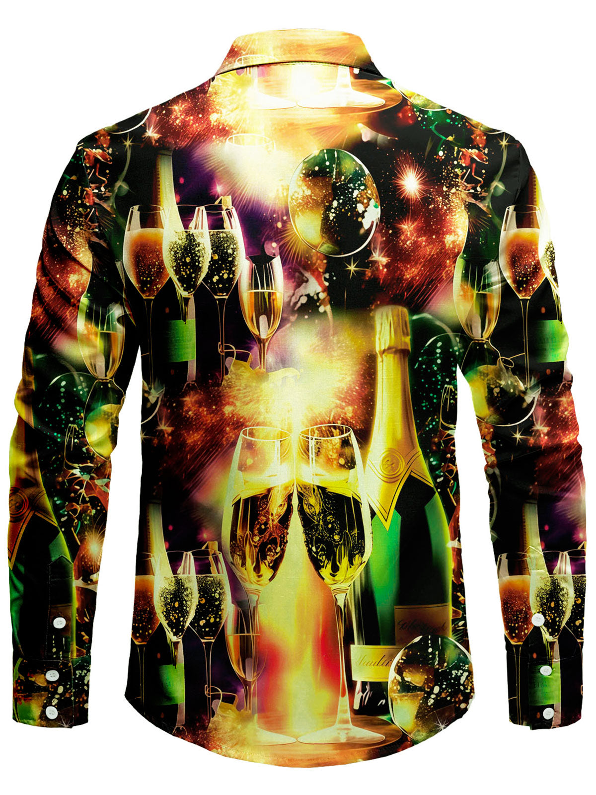 Chemise à manches longues boutonnée pour homme, imprimé disco champagne et feux d'artifice, idéale pour les fêtes de fin d'année