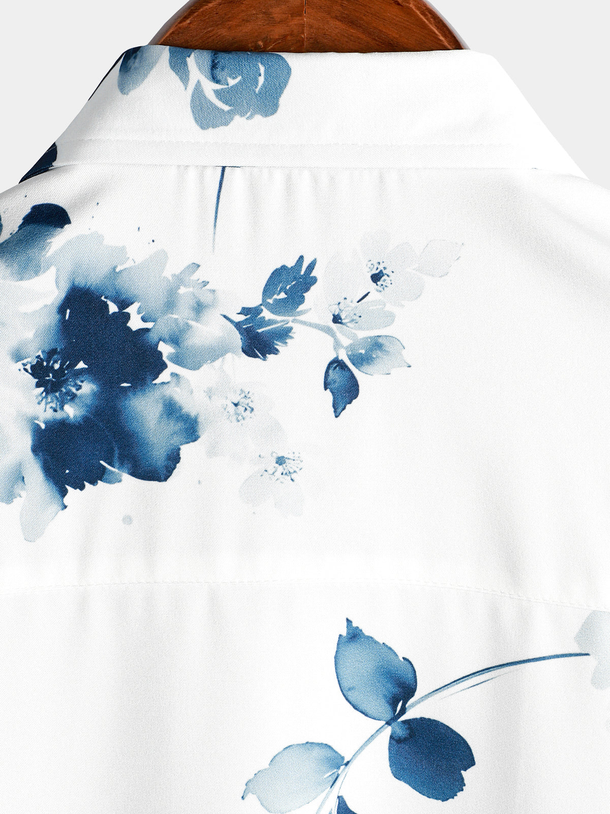 Chemise hawaïenne boutonnée à manches courtes en coton à imprimé floral bleu pour hommes