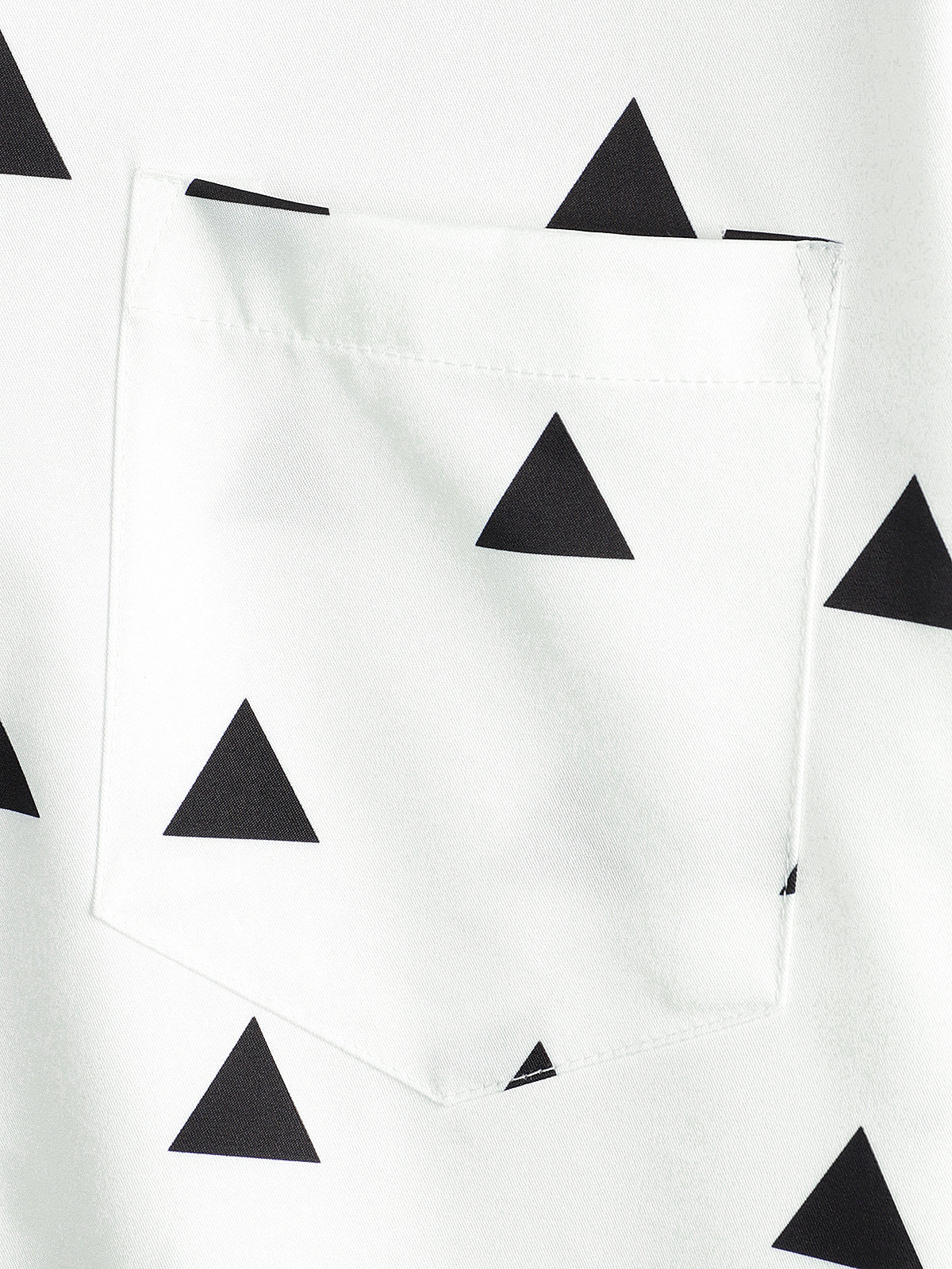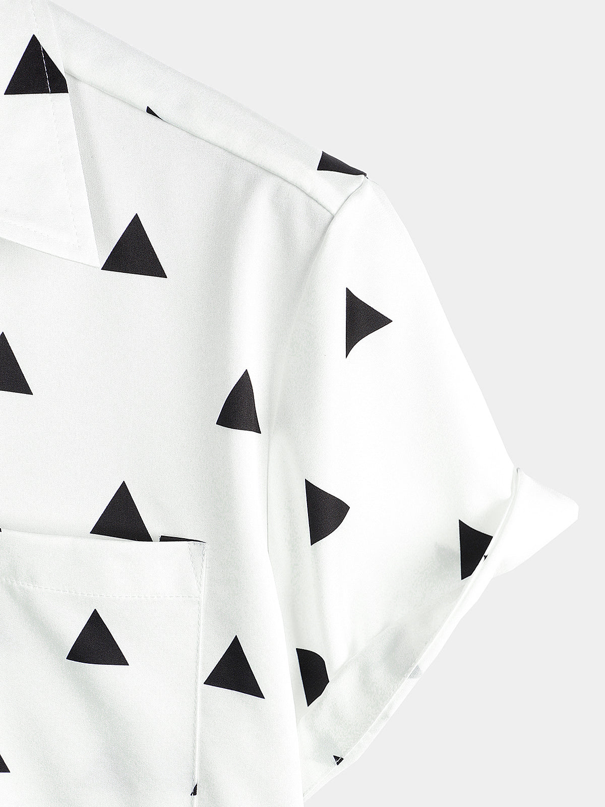 Chemise boutonnée de plage d'été à manches courtes avec imprimé géométrique triangle bleu et blanc pour hommes