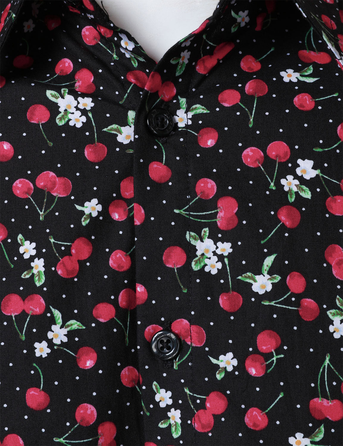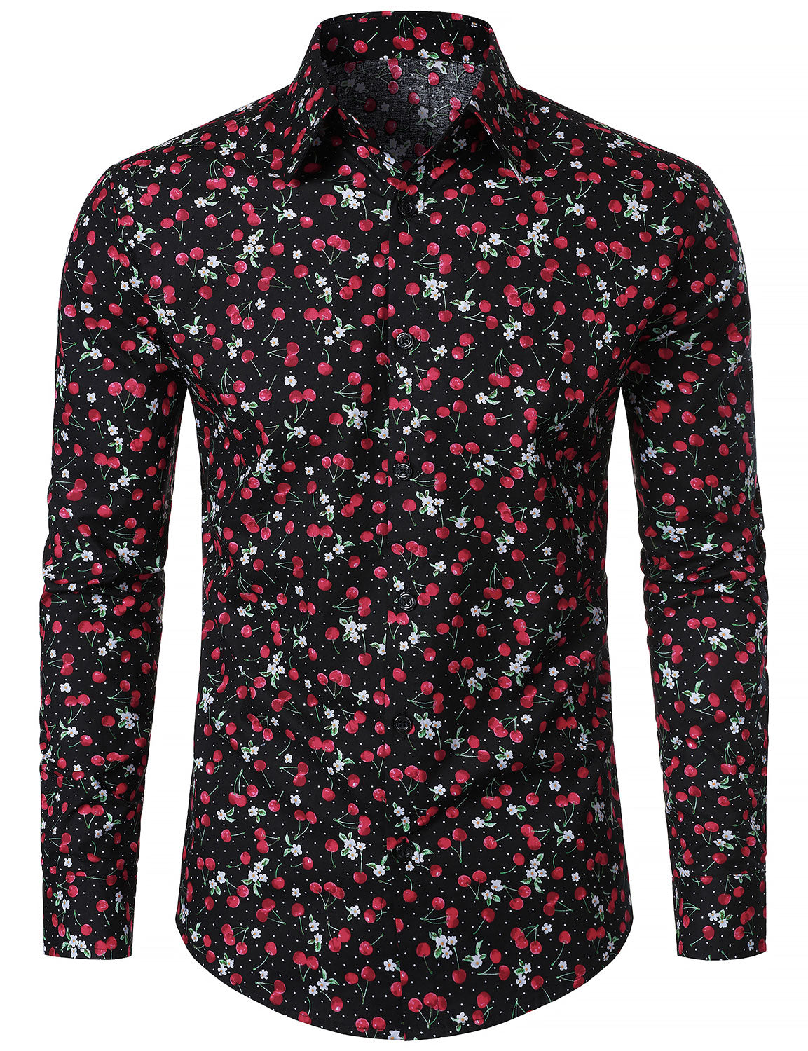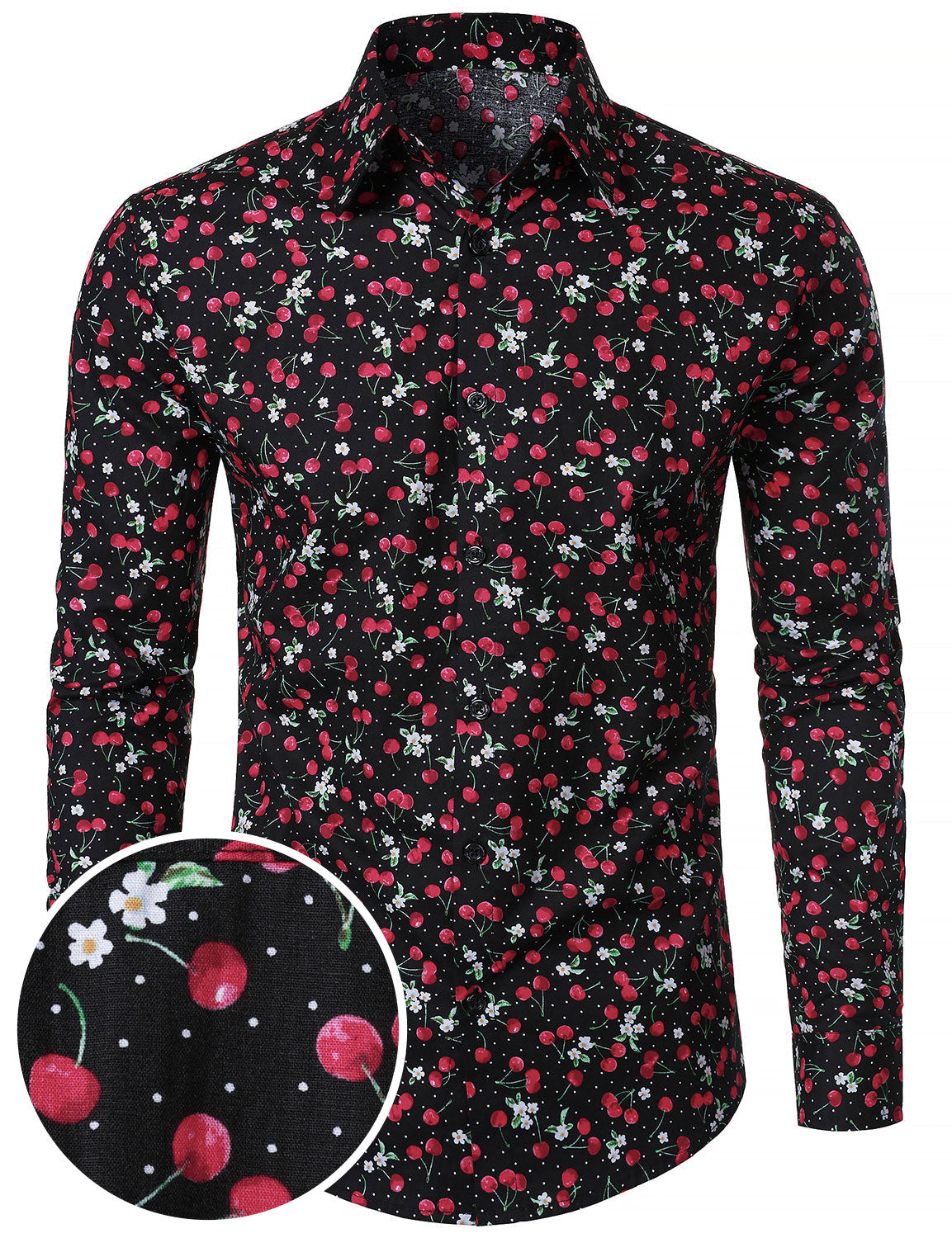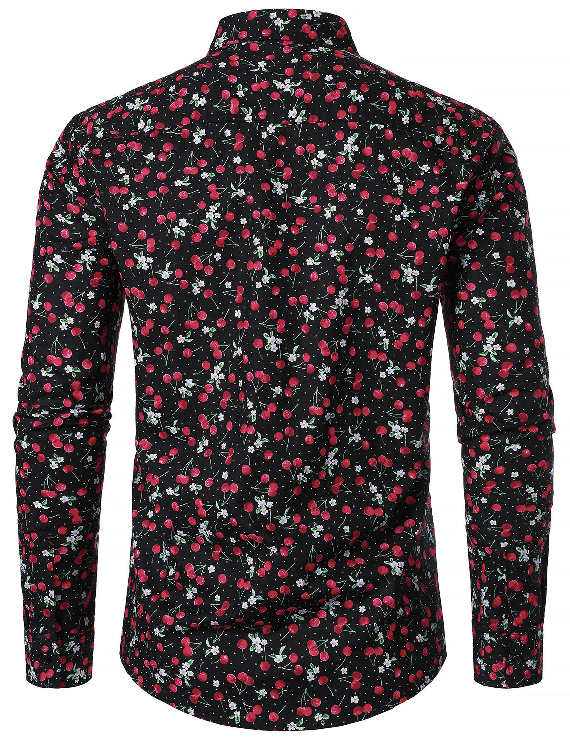 Chemise à manches longues en coton respirant à imprimé cerises pour homme, noire