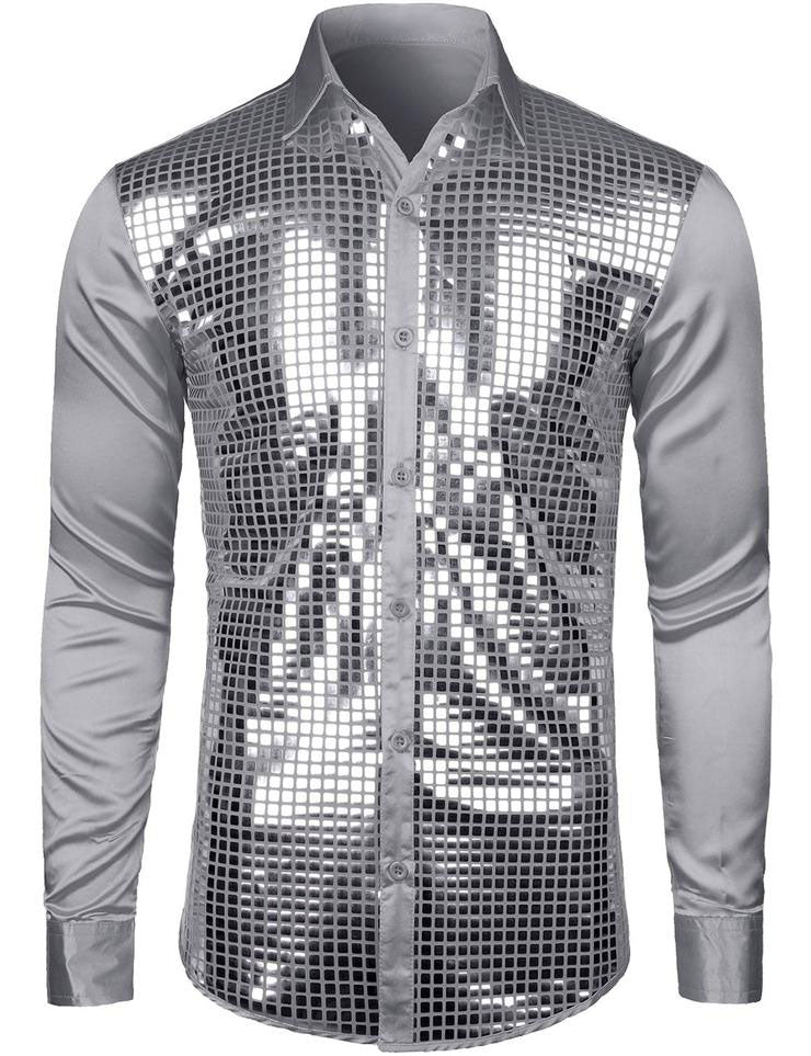 Chemise habillée pour hommes paillettes argentées à manches longues boutonnée chemise Disco Costume de fête