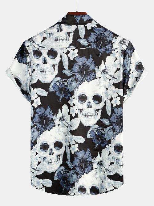 Chemise décontractée à manches courtes pour hommes, imprimé tête de mort florale bleue, bouton Cool